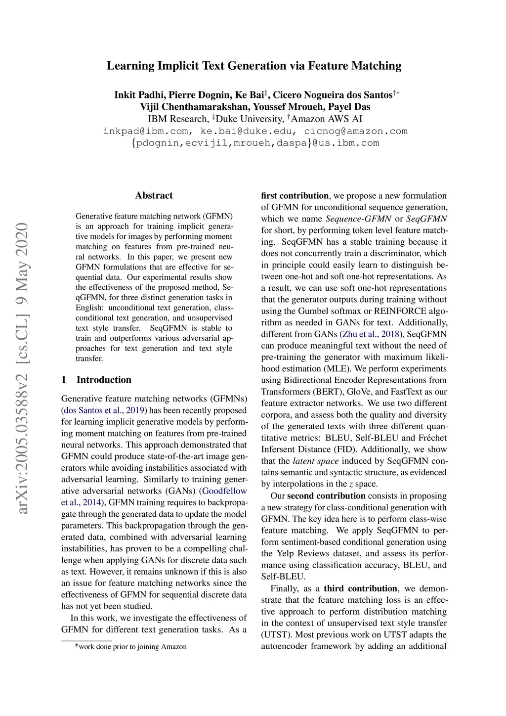 Learning Implicit Text Generation via Feature Matching