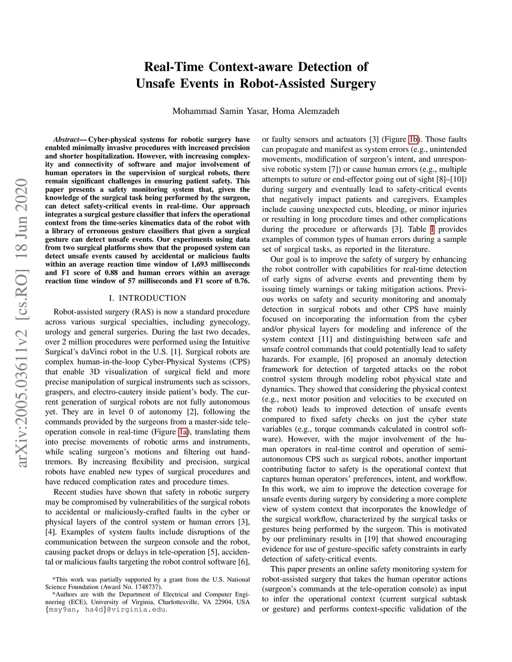 Cyber-physical systems for robotic surgery have enabled minimally invasive procedures with increased precision and shorter hospitalization. However, with increasing complexity and connectivity of software and major involvement of human operators in the supervision of surgical robots, there remain significant challenges in ensuring patient safety. This paper presents a safety monitoring system that, given the knowledge of the surgical task being performed by the surgeon, can detect safety-critical events in real-time. Our approach integrates a surgical gesture classifier that infers the operational context from the time-series kinematics data of the robot with a library of erroneous gesture classifiers that given a surgical gesture can detect unsafe events. Our experiments using data from two surgical platforms show that the proposed system can detect unsafe events caused by accidental or malicious faults within an average reaction time window of 1,693 milliseconds and F1 score of 0.88 and human errors within an average reaction time window of 57 milliseconds and F1 score of 0.76.