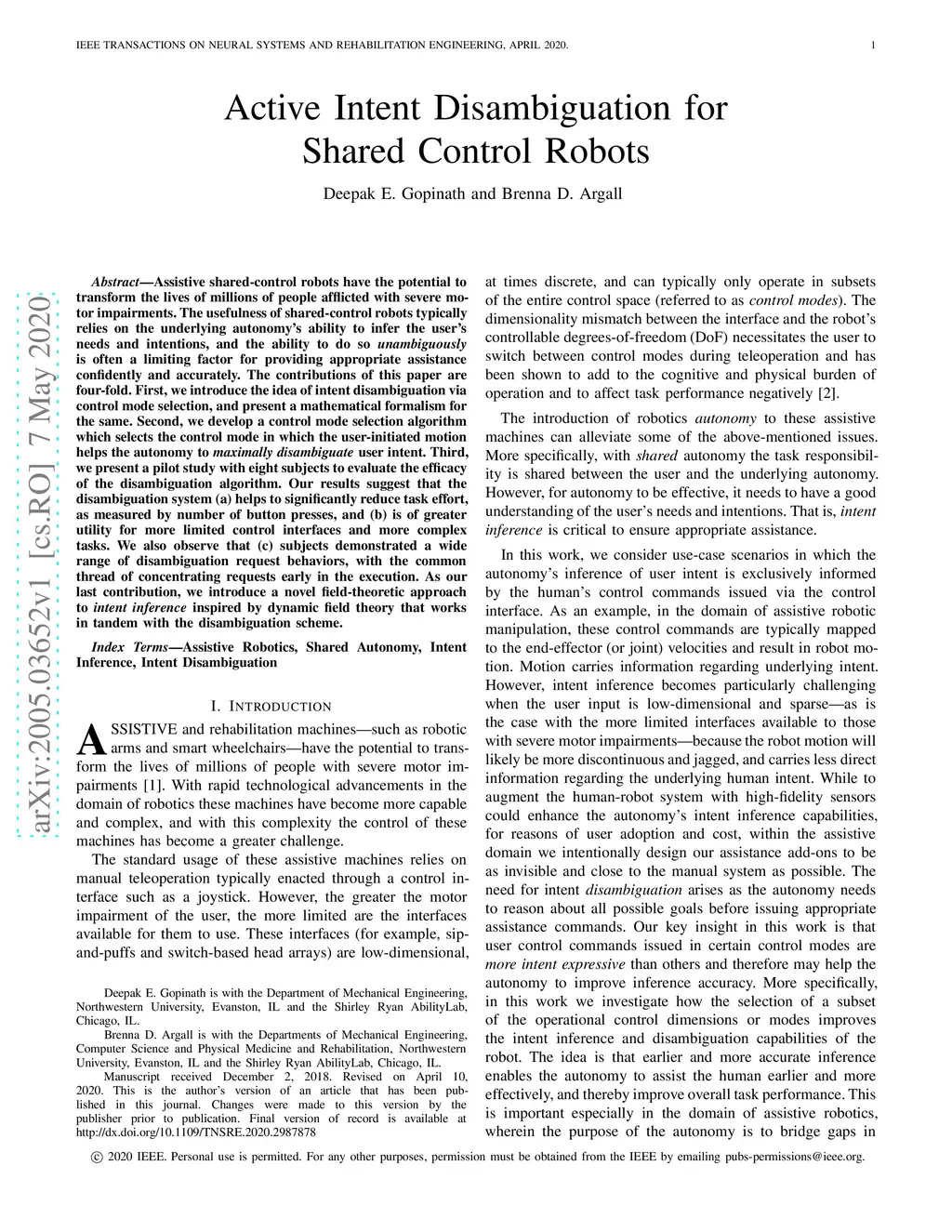 Assistive shared-control robots have the potential to transform the lives of millions of people afflicted with severe motor impairments. The usefulness of shared-control robots typically relies on the underlying autonomy's ability to infer the user's needs and intentions, and the ability to do so unambiguously is often a limiting factor for providing appropriate assistance confidently and accurately. The contributions of this paper are four-fold. First, we introduce the idea of intent disambiguation via control mode selection, and present a mathematical formalism for the same. Second, we develop a control mode selection algorithm which selects the control mode in which the user-initiated motion helps the autonomy to maximally disambiguate user intent. Third, we present a pilot study with eight subjects to evaluate the efficacy of the disambiguation algorithm. Our results suggest that the disambiguation system (a) helps to significantly reduce task effort, as measured by number of button presses, and (b) is of greater utility for more limited control interfaces and more complex tasks. We also observe that (c) subjects demonstrated a wide range of disambiguation request behaviors, with the common thread of concentrating requests early in the execution. As our last contribution, we introduce a novel field-theoretic approach to intent inference inspired by dynamic field theory that works in tandem with the disambiguation scheme.