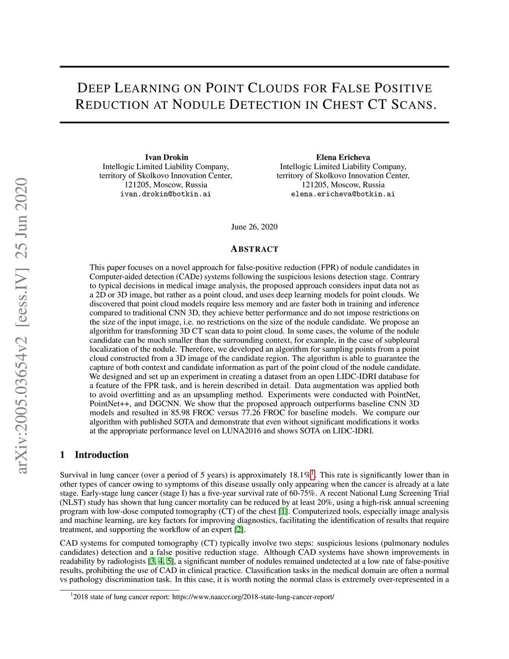 This paper focuses on a novel approach for false-positive reduction (FPR) of nodule candidates in Computer-aided detection (CADe) systems following the suspicious lesions detection stage. Contrary to typical decisions in medical image analysis, the proposed approach considers input data not as a 2D or 3D image, but rather as a point cloud, and uses deep learning models for point clouds. We discovered that point cloud models require less memory and are faster both in training and inference compared to traditional CNN 3D, they achieve better performance and do not impose restrictions on the size of the input image, i.e. no restrictions on the size of the nodule candidate. We propose an algorithm for transforming 3D CT scan data to point cloud. In some cases, the volume of the nodule candidate can be much smaller than the surrounding context, for example, in the case of subpleural localization of the nodule. Therefore, we developed an algorithm for sampling points from a point cloud constructed from a 3D image of the candidate region. The algorithm is able to guarantee the capture of both context and candidate information as part of the point cloud of the nodule candidate. We designed and set up an experiment in creating a dataset from an open LIDC-IDRI database for a feature of the FPR task, and is herein described in detail. Data augmentation was applied both to avoid overfitting and as an upsampling method. Experiments were conducted with PointNet, PointNet++, and DGCNN. We show that the proposed approach outperforms baseline CNN 3D models and resulted in 85.98 FROC versus 77.26 FROC for baseline models. We compare our algorithm with published SOTA and demonstrate that even without significant modifications it works at the appropriate performance level on LUNA2016 and shows SOTA on LIDC-IDRI.