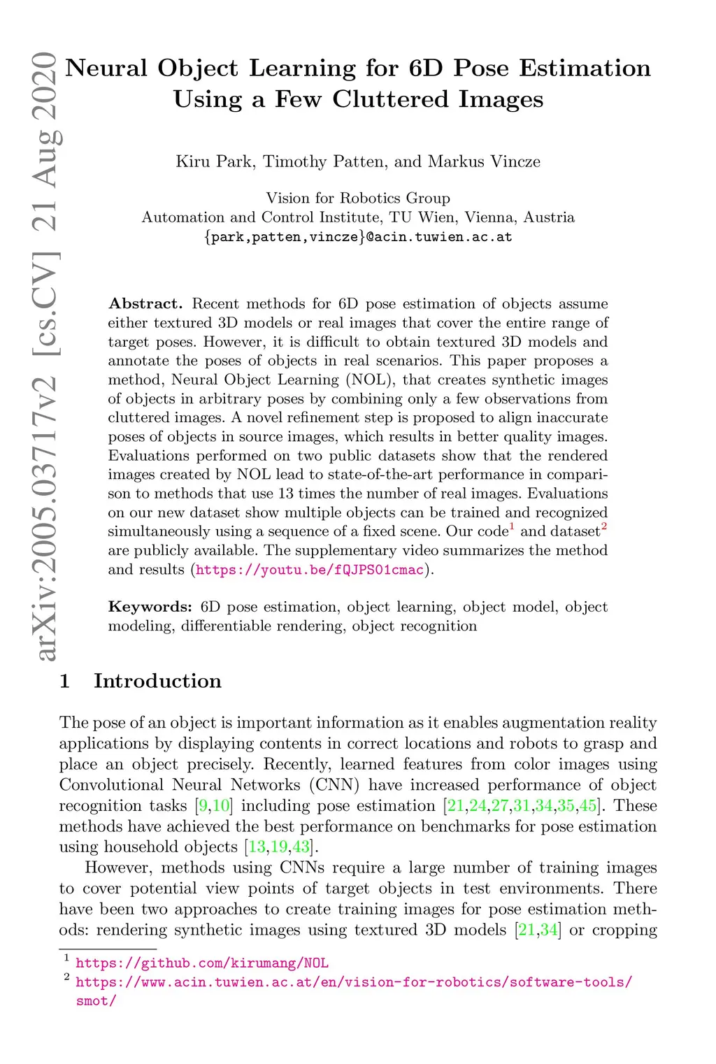Neural Object Learning for 6D Pose Estimation Using a Few Cluttered