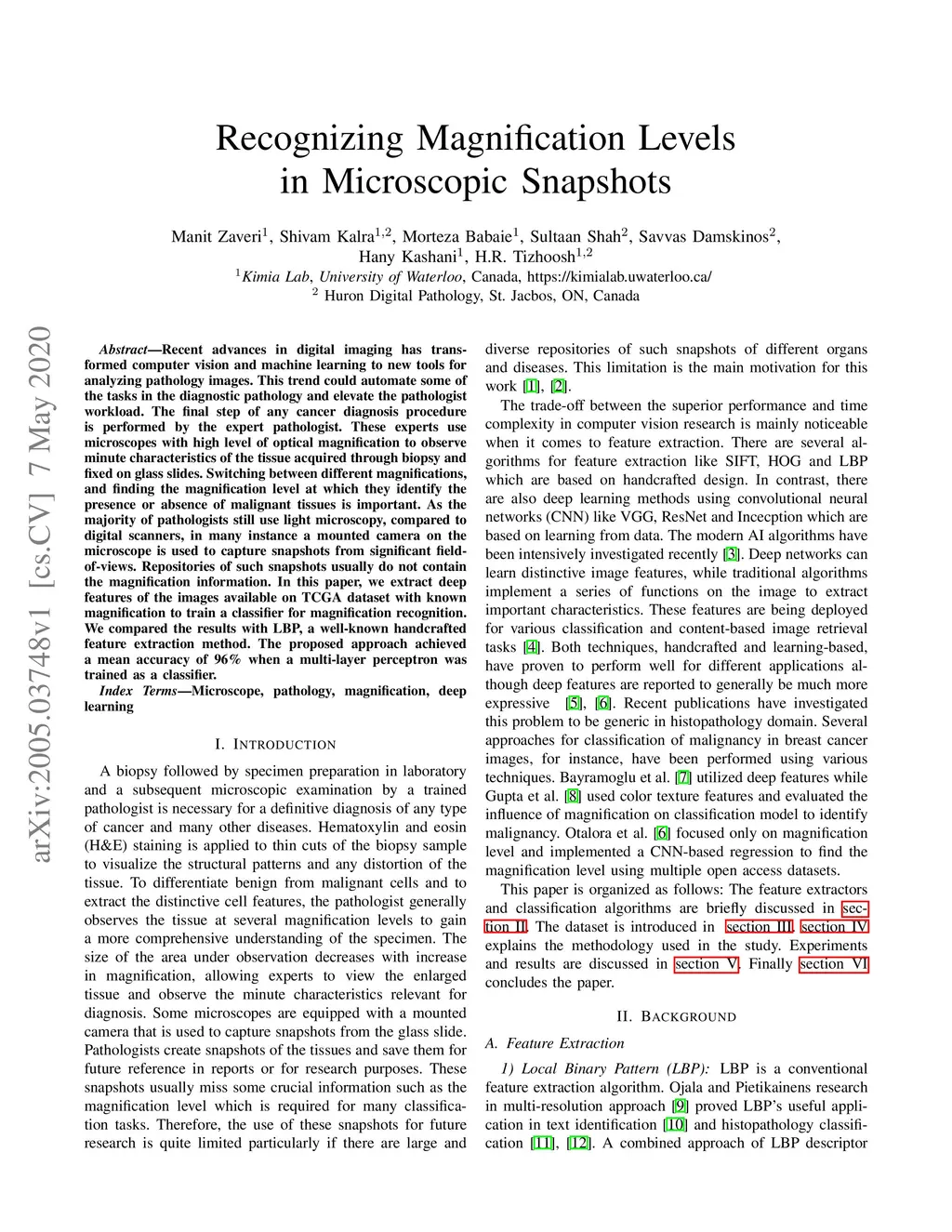Recent advances in digital imaging has transformed computer vision and machine learning to new tools for analyzing pathology images. This trend could automate some of the tasks in the diagnostic pathology and elevate the pathologist workload. The final step of any cancer diagnosis procedure is performed by the expert pathologist. These experts use microscopes with high level of optical magnification to observe minute characteristics of the tissue acquired through biopsy and fixed on glass slides. Switching between different magnifications, and finding the magnification level at which they identify the presence or absence of malignant tissues is important. As the majority of pathologists still use light microscopy, compared to digital scanners, in many instance a mounted camera on the microscope is used to capture snapshots from significant field-of-views. Repositories of such snapshots usually do not contain the magnification information. In this paper, we extract deep features of the images available on TCGA dataset with known magnification to train a classifier for magnification recognition. We compared the results with LBP, a well-known handcrafted feature extraction method. The proposed approach achieved a mean accuracy of 96% when a multi-layer perceptron was trained as a classifier.