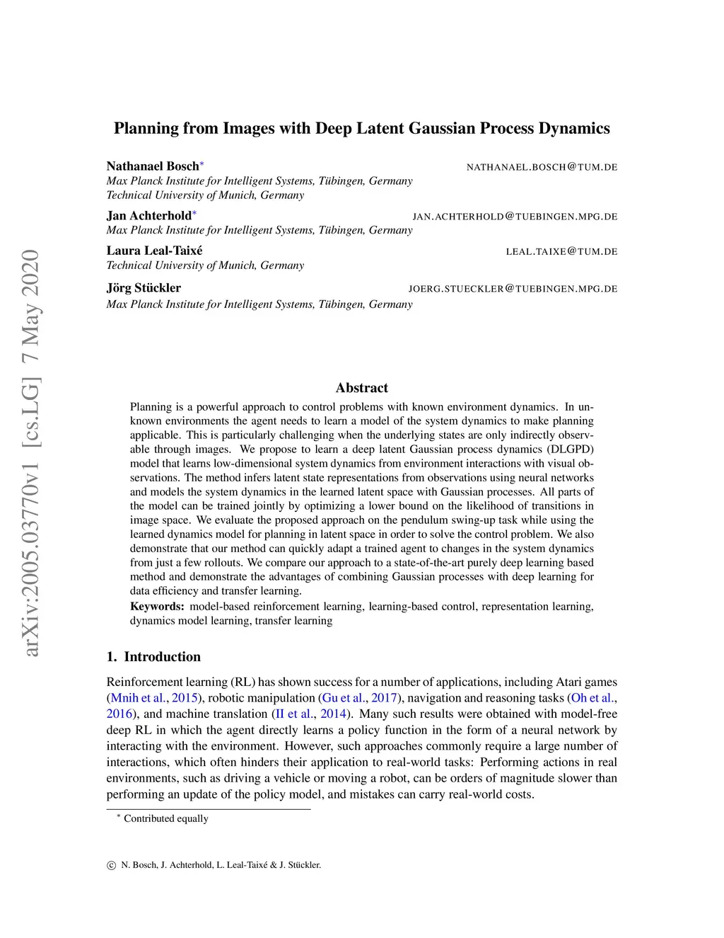 Planning is a powerful approach to control problems with known environment dynamics. In unknown environments the agent needs to learn a model of the system dynamics to make planning applicable. This is particularly challenging when the underlying states are only indirectly observable through images. We propose to learn a deep latent Gaussian process dynamics (DLGPD) model that learns low-dimensional system dynamics from environment interactions with visual observations. The method infers latent state representations from observations using neural networks and models the system dynamics in the learned latent space with Gaussian processes. All parts of the model can be trained jointly by optimizing a lower bound on the likelihood of transitions in image space. We evaluate the proposed approach on the pendulum swing-up task while using the learned dynamics model for planning in latent space in order to solve the control problem. We also demonstrate that our method can quickly adapt a trained agent to changes in the system dynamics from just a few rollouts. We compare our approach to a state-of-the-art purely deep learning based method and demonstrate the advantages of combining Gaussian processes with deep learning for data efficiency and transfer learning.