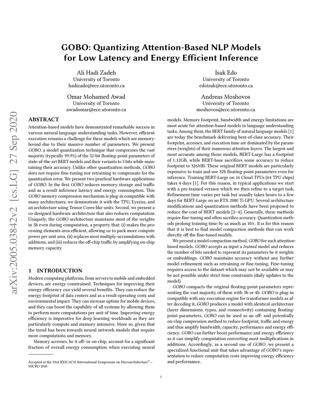 GOBO: Quantizing Attention-Based NLP Models for Low Latency and Energy