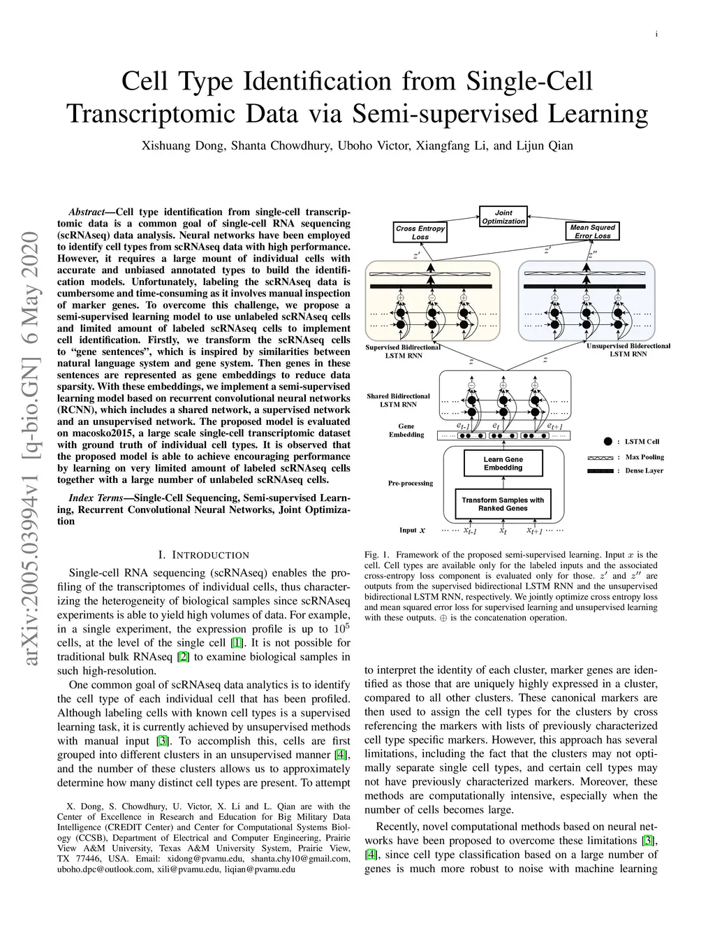 Cell type identification from single-cell transcriptomic data is a common goal of single-cell RNA sequencing (scRNAseq) data analysis. Neural networks have been employed to identify cell types from scRNAseq data with high performance. However, it requires a large mount of individual cells with accurate and unbiased annotated types to build the identification models. Unfortunately, labeling the scRNAseq data is cumbersome and time-consuming as it involves manual inspection of marker genes. To overcome this challenge, we propose a semi-supervised learning model to use unlabeled scRNAseq cells and limited amount of labeled scRNAseq cells to implement cell identification. Firstly, we transform the scRNAseq cells to "gene sentences", which is inspired by similarities between natural language system and gene system. Then genes in these sentences are represented as gene embeddings to reduce data sparsity. With these embeddings, we implement a semi-supervised learning model based on recurrent convolutional neural networks (RCNN), which includes a shared network, a supervised network and an unsupervised network. The proposed model is evaluated on macosko2015, a large scale single-cell transcriptomic dataset with ground truth of individual cell types. It is observed that the proposed model is able to achieve encouraging performance by learning on very limited amount of labeled scRNAseq cells together with a large number of unlabeled scRNAseq cells.