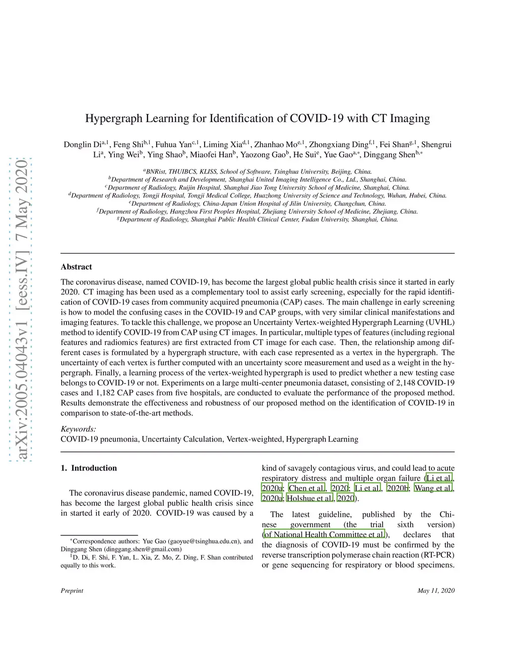 The coronavirus disease, named COVID-19, has become the largest global public health crisis since it started in early 2020. CT imaging has been used as a complementary tool to assist early screening, especially for the rapid identification of COVID-19 cases from community acquired pneumonia (CAP) cases. The main challenge in early screening is how to model the confusing cases in the COVID-19 and CAP groups, with very similar clinical manifestations and imaging features. To tackle this challenge, we propose an Uncertainty Vertex-weighted Hypergraph Learning (UVHL) method to identify COVID-19 from CAP using CT images. In particular, multiple types of features (including regional features and radiomics features) are first extracted from CT image for each case. Then, the relationship among different cases is formulated by a hypergraph structure, with each case represented as a vertex in the hypergraph. The uncertainty of each vertex is further computed with an uncertainty score measurement and used as a weight in the hypergraph. Finally, a learning process of the vertex-weighted hypergraph is used to predict whether a new testing case belongs to COVID-19 or not. Experiments on a large multi-center pneumonia dataset, consisting of 2,148 COVID-19 cases and 1,182 CAP cases from five hospitals, are conducted to evaluate the performance of the proposed method. Results demonstrate the effectiveness and robustness of our proposed method on the identification of COVID-19 in comparison to state-of-the-art methods.