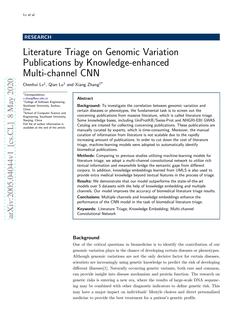 Background: To investigate the correlation between genomic variation and certain diseases or phenotypes, the fundamental task is to screen out the concerning publications from massive literature, which is called literature triage. Some knowledge bases, including UniProtKB/Swiss-Prot and NHGRI-EBI GWAS Catalog are created for collecting concerning publications. These publications are manually curated by experts, which is time-consuming. Moreover, the manual curation of information from literature is not scalable due to the rapidly increasing amount of publications. In order to cut down the cost of literature triage, machine-learning models were adopted to automatically identify biomedical publications. Methods: Comparing to previous studies utilizing machine-learning models for literature triage, we adopt a multi-channel convolutional network to utilize rich textual information and meanwhile bridge the semantic gaps from different corpora. In addition, knowledge embeddings learned from UMLS is also used to provide extra medical knowledge beyond textual features in the process of triage. Results: We demonstrate that our model outperforms the state-of-the-art models over 5 datasets with the help of knowledge embedding and multiple channels. Our model improves the accuracy of biomedical literature triage results. Conclusions: Multiple channels and knowledge embeddings enhance the performance of the CNN model in the task of biomedical literature triage. Keywords: Literature Triage; Knowledge Embedding; Multi-channel Convolutional Network