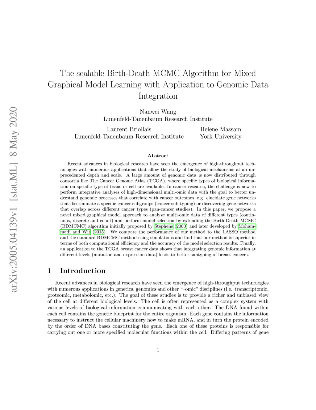 Recent advances in biological research have seen the emergence of high-throughput technologies with numerous applications that allow the study of biological mechanisms at an unprecedented depth and scale. A large amount of genomic data is now distributed through consortia like The Cancer Genome Atlas (TCGA), where specific types of biological information on specific type of tissue or cell are available. In cancer research, the challenge is now to perform integrative analyses of high-dimensional multi-omic data with the goal to better understand genomic processes that correlate with cancer outcomes, e.g. elucidate gene networks that discriminate a specific cancer subgroups (cancer sub-typing) or discovering gene networks that overlap across different cancer types (pan-cancer studies). In this paper, we propose a novel mixed graphical model approach to analyze multi-omic data of different types (continuous, discrete and count) and perform model selection by extending the Birth-Death MCMC (BDMCMC) algorithm initially proposed by \citet{stephens2000bayesian} and later developed by \cite{mohammadi2015bayesian}. We compare the performance of our method to the LASSO method and the standard BDMCMC method using simulations and find that our method is superior in terms of both computational efficiency and the accuracy of the model selection results. Finally, an application to the TCGA breast cancer data shows that integrating genomic information at different levels (mutation and expression data) leads to better subtyping of breast cancers.