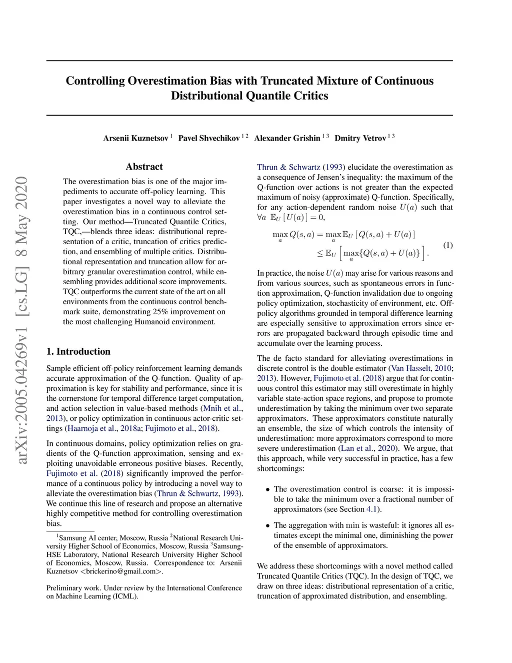The overestimation bias is one of the major impediments to accurate off-policy learning. This paper investigates a novel way to alleviate the overestimation bias in a continuous control setting. Our method---Truncated Quantile Critics, TQC,---blends three ideas: distributional representation of a critic, truncation of critics prediction, and ensembling of multiple critics. Distributional representation and truncation allow for arbitrary granular overestimation control, while ensembling provides additional score improvements. TQC outperforms the current state of the art on all environments from the continuous control benchmark suite, demonstrating 25% improvement on the most challenging Humanoid environment.