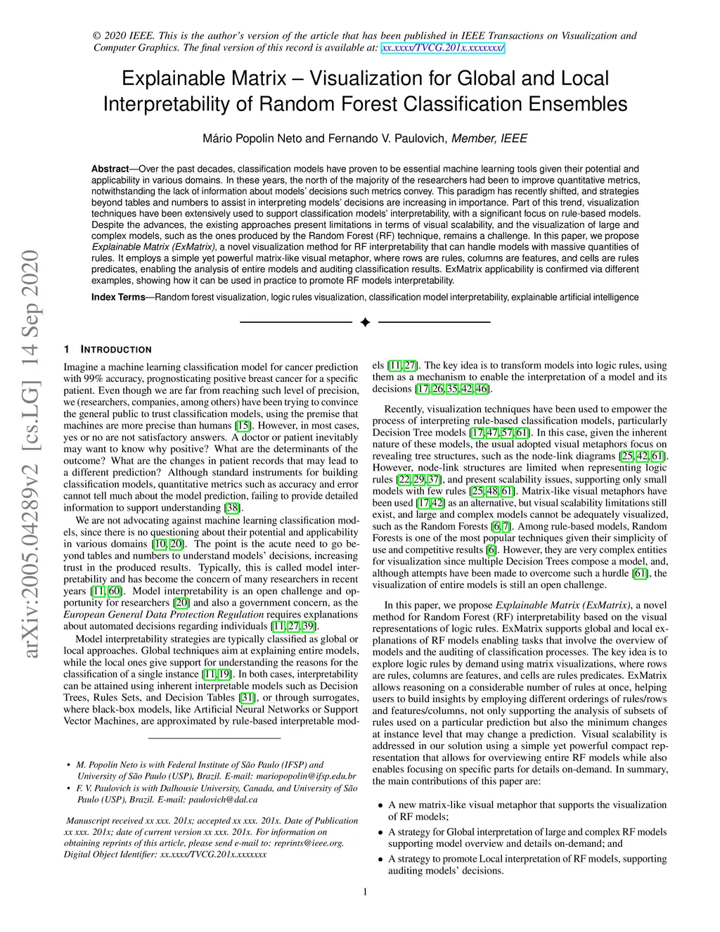 Over the past decades, classification models have proven to be essential machine learning tools given their potential and applicability in various domains. In these years, the north of the majority of the researchers had been to improve quantitative metrics, notwithstanding the lack of information about models' decisions such metrics convey. This paradigm has recently shifted, and strategies beyond tables and numbers to assist in interpreting models' decisions are increasing in importance. Part of this trend, visualization techniques have been extensively used to support classification models' interpretability, with a significant focus on rule-based models. Despite the advances, the existing approaches present limitations in terms of visual scalability, and the visualization of large and complex models, such as the ones produced by the Random Forest (RF) technique, remains a challenge. In this paper, we propose Explainable Matrix (ExMatrix), a novel visualization method for RF interpretability that can handle models with massive quantities of rules. It employs a simple yet powerful matrix-like visual metaphor, where rows are rules, columns are features, and cells are rules predicates, enabling the analysis of entire models and auditing classification results. ExMatrix applicability is confirmed via different examples, showing how it can be used in practice to promote RF models interpretability.