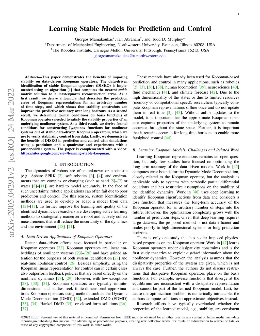 This paper demonstrates the benefits of imposing stability on data-driven Koopman operators. The data-driven identification of stable Koopman operators (DISKO) is implemented using an algorithm \cite{mamakoukas_stableLDS2020} that computes the nearest \textit{stable} matrix solution to a least-squares reconstruction error. As a first result, we derive a formula that describes the prediction error of Koopman representations for an arbitrary number of time steps, and which shows that stability constraints can improve the predictive accuracy over long horizons. As a second result, we determine formal conditions on basis functions of Koopman operators needed to satisfy the stability properties of an underlying nonlinear system. As a third result, we derive formal conditions for constructing Lyapunov functions for nonlinear systems out of stable data-driven Koopman operators, which we use to verify stabilizing control from data. Lastly, we demonstrate the benefits of DISKO in prediction and control with simulations using a pendulum and a quadrotor and experiments with a pusher-slider system. The paper is complemented with a video: \url{https://sites.google.com/view/learning-stable-koopman}.