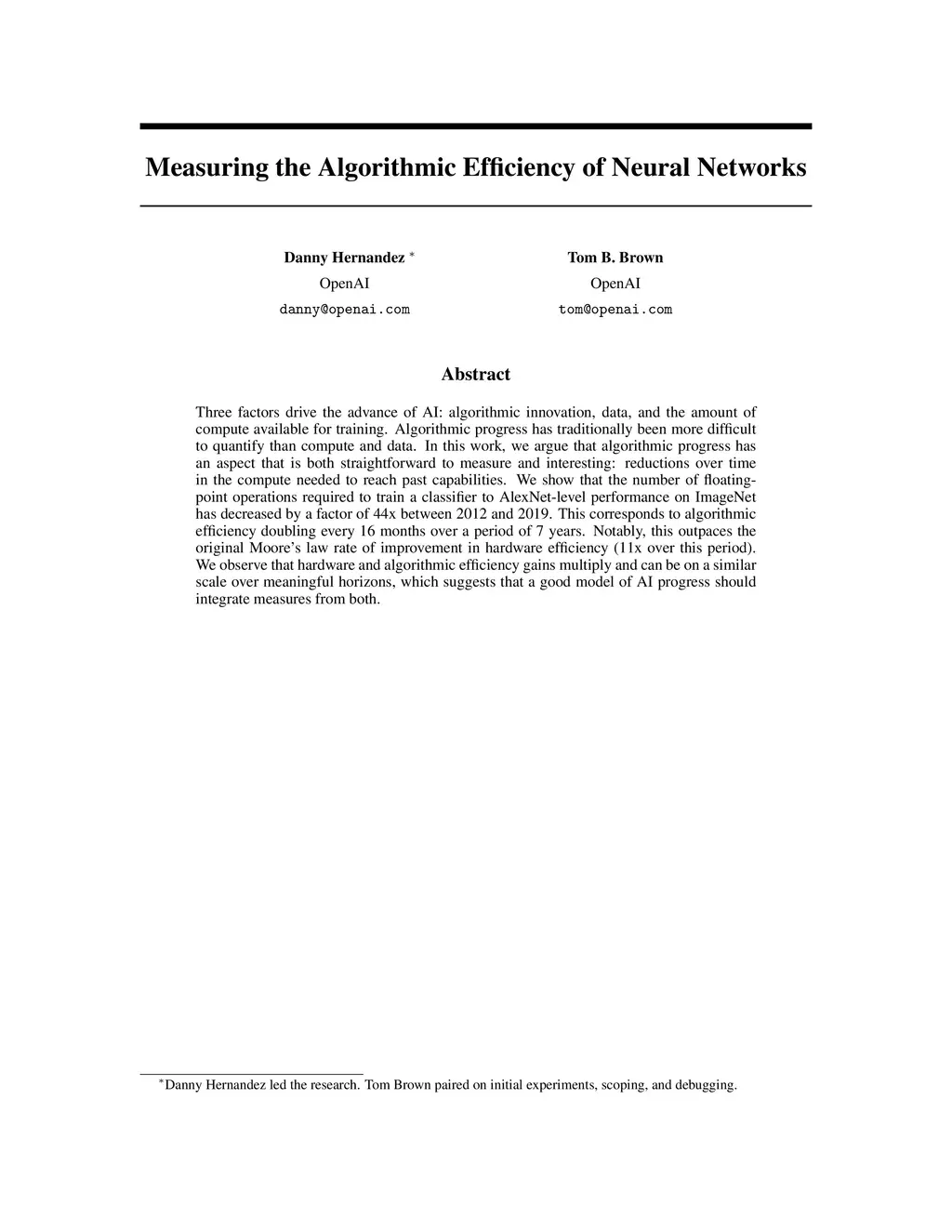 Three factors drive the advance of AI: algorithmic innovation, data, and the amount of compute available for training. Algorithmic progress has traditionally been more difficult to quantify than compute and data. In this work, we argue that algorithmic progress has an aspect that is both straightforward to measure and interesting: reductions over time in the compute needed to reach past capabilities. We show that the number of floating-point operations required to train a classifier to AlexNet-level performance on ImageNet has decreased by a factor of 44x between 2012 and 2019. This corresponds to algorithmic efficiency doubling every 16 months over a period of 7 years. By contrast, Moore's Law would only have yielded an 11x cost improvement. We observe that hardware and algorithmic efficiency gains multiply and can be on a similar scale over meaningful horizons, which suggests that a good model of AI progress should integrate measures from both.