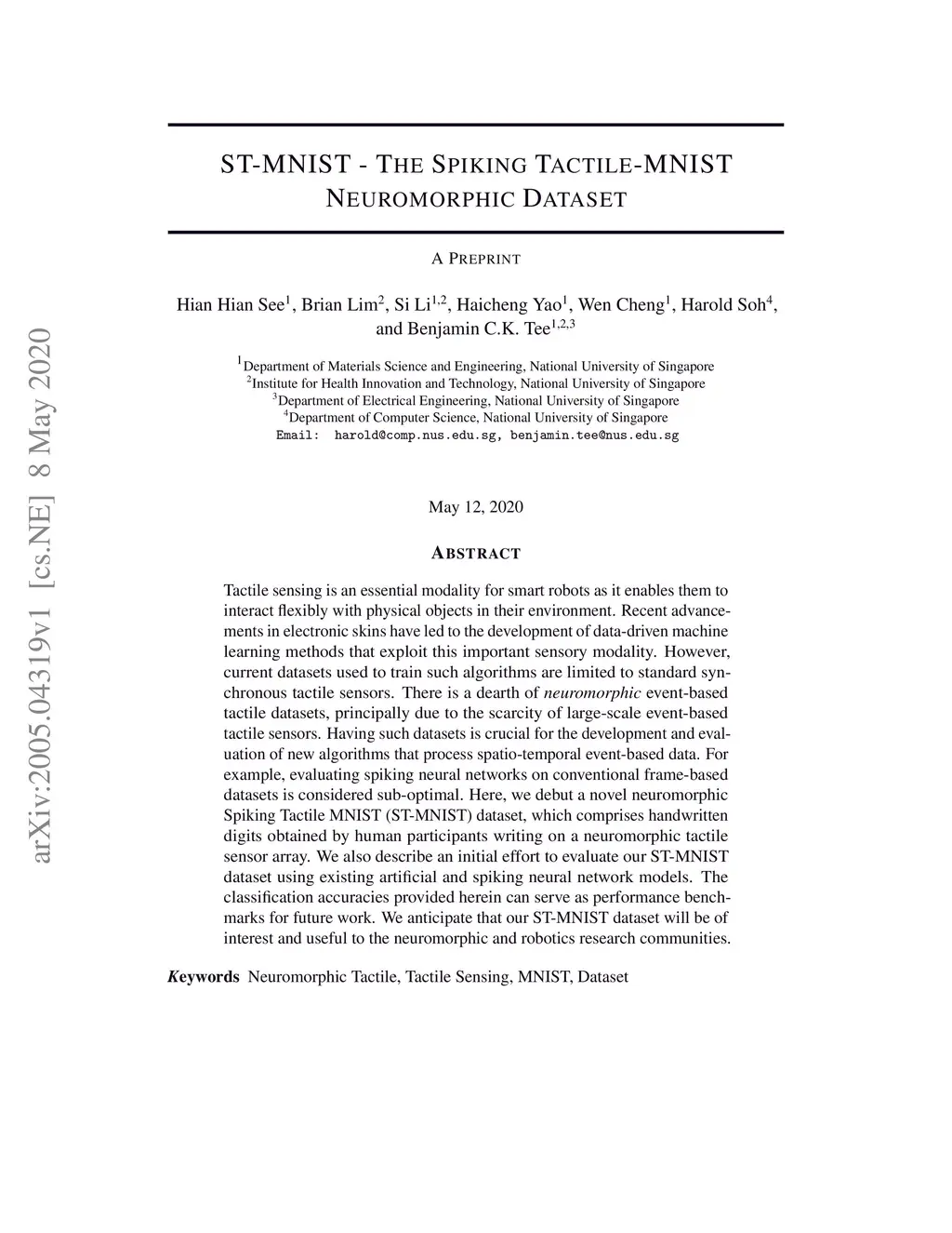 Tactile sensing is an essential modality for smart robots as it enables them to interact flexibly with physical objects in their environment. Recent advancements in electronic skins have led to the development of data-driven machine learning methods that exploit this important sensory modality. However, current datasets used to train such algorithms are limited to standard synchronous tactile sensors. There is a dearth of neuromorphic event-based tactile datasets, principally due to the scarcity of large-scale event-based tactile sensors. Having such datasets is crucial for the development and evaluation of new algorithms that process spatio-temporal event-based data. For example, evaluating spiking neural networks on conventional frame-based datasets is considered sub-optimal. Here, we debut a novel neuromorphic Spiking Tactile MNIST (ST-MNIST) dataset, which comprises handwritten digits obtained by human participants writing on a neuromorphic tactile sensor array. We also describe an initial effort to evaluate our ST-MNIST dataset using existing artificial and spiking neural network models. The classification accuracies provided herein can serve as performance benchmarks for future work. We anticipate that our ST-MNIST dataset will be of interest and useful to the neuromorphic and robotics research communities.
