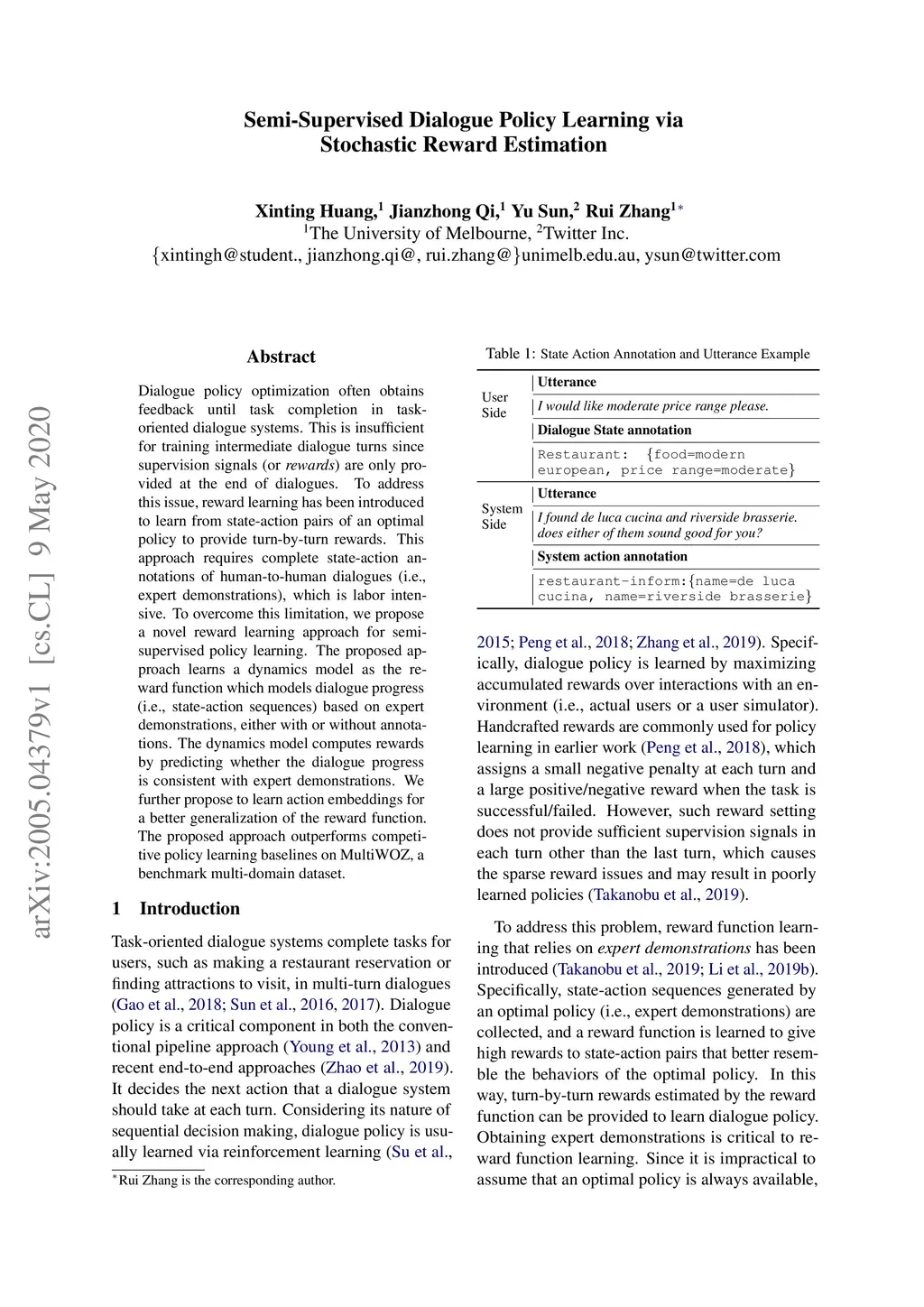 Dialogue policy optimization often obtains feedback until task completion in task-oriented dialogue systems. This is insufficient for training intermediate dialogue turns since supervision signals (or rewards) are only provided at the end of dialogues. To address this issue, reward learning has been introduced to learn from state-action pairs of an optimal policy to provide turn-by-turn rewards. This approach requires complete state-action annotations of human-to-human dialogues (i.e., expert demonstrations), which is labor intensive. To overcome this limitation, we propose a novel reward learning approach for semi-supervised policy learning. The proposed approach learns a dynamics model as the reward function which models dialogue progress (i.e., state-action sequences) based on expert demonstrations, either with or without annotations. The dynamics model computes rewards by predicting whether the dialogue progress is consistent with expert demonstrations. We further propose to learn action embeddings for a better generalization of the reward function. The proposed approach outperforms competitive policy learning baselines on MultiWOZ, a benchmark multi-domain dataset.
