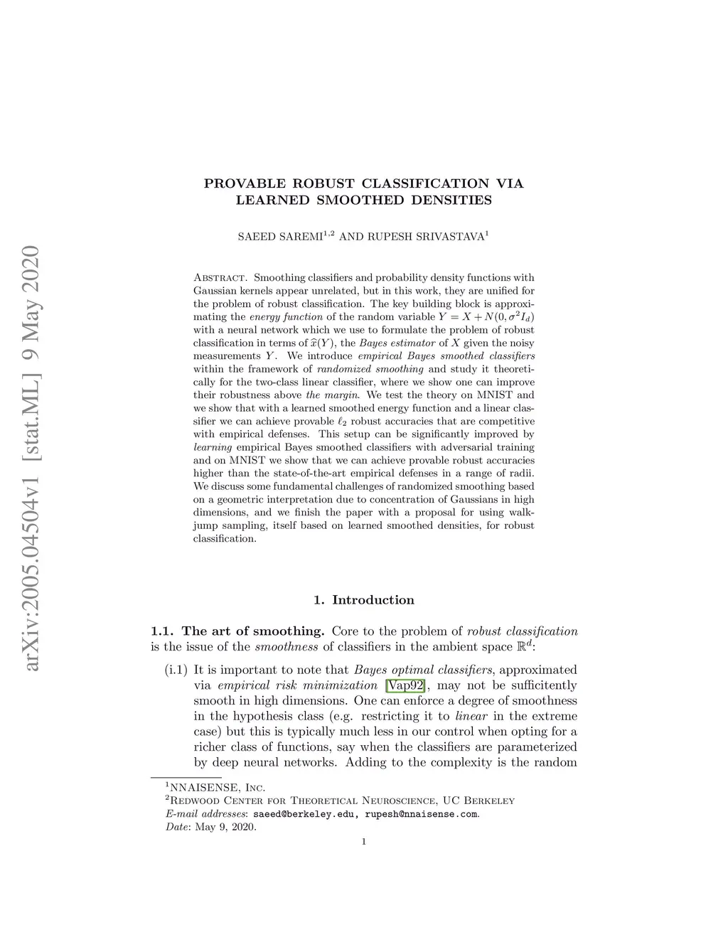 Smoothing classifiers and probability density functions with Gaussian kernels appear unrelated, but in this work, they are unified for the problem of robust classification. The key building block is approximating the of the random variable with a neural network which we use to formulate the problem of robust classification in terms of , the of given the noisy measurements . We introduce within the framework of and study it theoretically for the two-class linear classifier, where we show one can improve their robustness above . We test the theory on MNIST and we show that with a learned smoothed energy function and a linear classifier we can achieve provable robust accuracies that are competitive with empirical defenses. This setup can be significantly improved by empirical Bayes smoothed classifiers with adversarial training and on MNIST we show that we can achieve provable robust accuracies higher than the state-of-the-art empirical defenses in a range of radii. We discuss some fundamental challenges of randomized smoothing based on a geometric interpretation due to concentration of Gaussians in high dimensions, and we finish the paper with a proposal for using walk-jump sampling, itself based on learned smoothed densities, for robust classification.