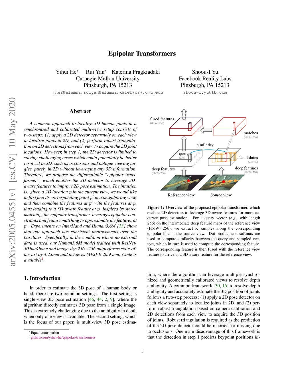 A common approach to localize 3D human joints in a synchronized and calibrated multi-view setup consists of two-steps: (1) apply a 2D detector separately on each view to localize joints in 2D, and (2) perform robust triangulation on 2D detections from each view to acquire the 3D joint locations. However, in step 1, the 2D detector is limited to solving challenging cases which could potentially be better resolved in 3D, such as occlusions and oblique viewing angles, purely in 2D without leveraging any 3D information. Therefore, we propose the differentiable "epipolar transformer", which enables the 2D detector to leverage 3D-aware features to improve 2D pose estimation. The intuition is: given a 2D location p in the current view, we would like to first find its corresponding point p' in a neighboring view, and then combine the features at p' with the features at p, thus leading to a 3D-aware feature at p. Inspired by stereo matching, the epipolar transformer leverages epipolar constraints and feature matching to approximate the features at p'. Experiments on InterHand and Human3.6M show that our approach has consistent improvements over the baselines. Specifically, in the condition where no external data is used, our Human3.6M model trained with ResNet-50 backbone and image size 256 x 256 outperforms state-of-the-art by 4.23 mm and achieves MPJPE 26.9 mm.
