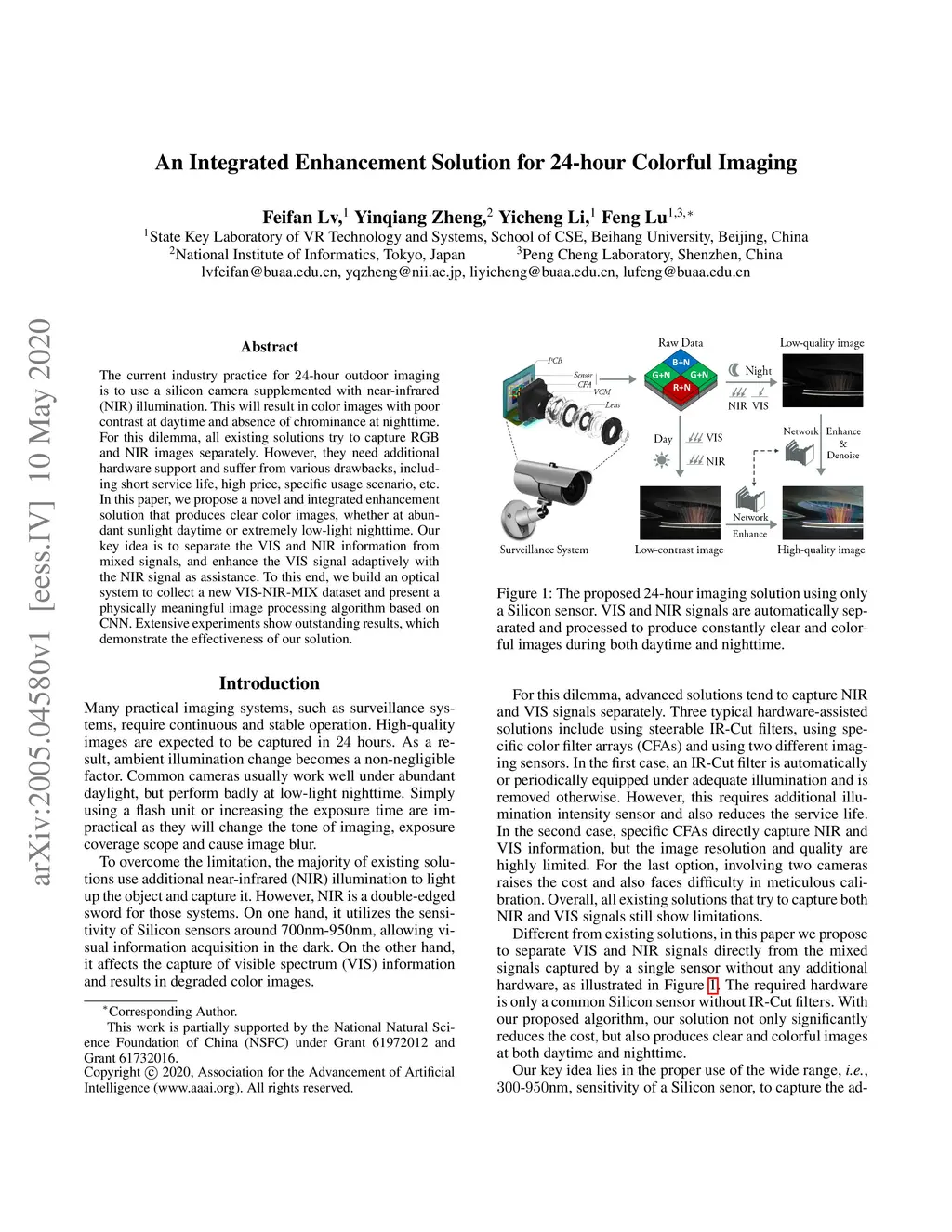 The current industry practice for 24-hour outdoor imaging is to use a silicon camera supplemented with near-infrared (NIR) illumination. This will result in color images with poor contrast at daytime and absence of chrominance at nighttime. For this dilemma, all existing solutions try to capture RGB and NIR images separately. However, they need additional hardware support and suffer from various drawbacks, including short service life, high price, specific usage scenario, etc. In this paper, we propose a novel and integrated enhancement solution that produces clear color images, whether at abundant sunlight daytime or extremely low-light nighttime. Our key idea is to separate the VIS and NIR information from mixed signals, and enhance the VIS signal adaptively with the NIR signal as assistance. To this end, we build an optical system to collect a new VIS-NIR-MIX dataset and present a physically meaningful image processing algorithm based on CNN. Extensive experiments show outstanding results, which demonstrate the effectiveness of our solution.