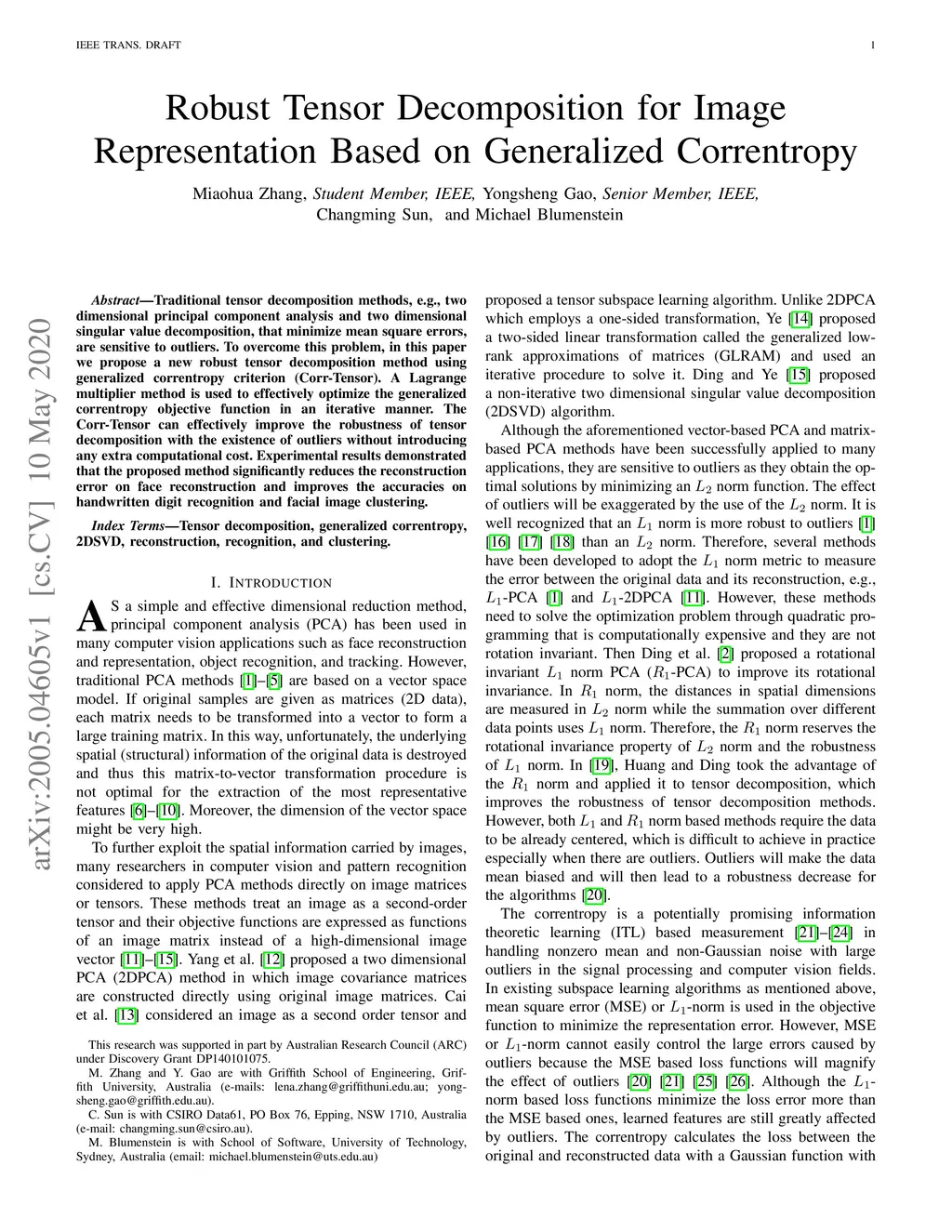 Traditional tensor decomposition methods, e.g., two dimensional principal component analysis and two dimensional singular value decomposition, that minimize mean square errors, are sensitive to outliers. To overcome this problem, in this paper we propose a new robust tensor decomposition method using generalized correntropy criterion (Corr-Tensor). A Lagrange multiplier method is used to effectively optimize the generalized correntropy objective function in an iterative manner. The Corr-Tensor can effectively improve the robustness of tensor decomposition with the existence of outliers without introducing any extra computational cost. Experimental results demonstrated that the proposed method significantly reduces the reconstruction error on face reconstruction and improves the accuracies on handwritten digit recognition and facial image clustering.