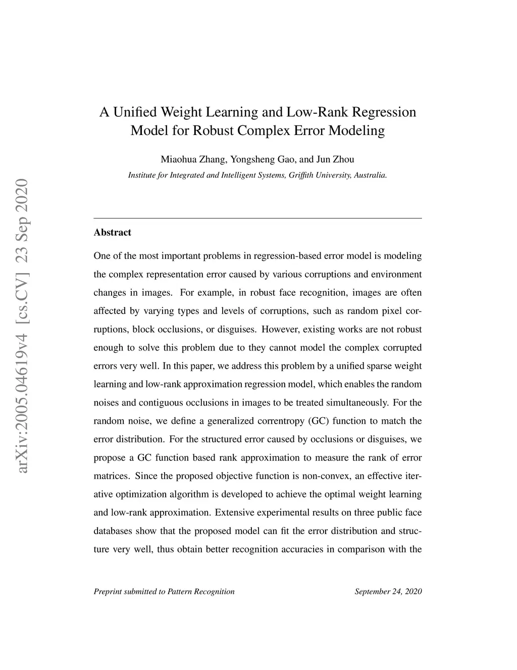 Regression-based error modelling has been extensively studied for face recognition in recent years. The most important problem in regression-based error model is fitting the complex representation error caused by various corruptions and environment changes. However, existing works are not robust enough to model the complex corrupted errors. In this paper, we address this problem by a unified sparse weight learning and low-rank approximation regression model and applied it to the robust face recognition in the presence of varying types and levels of corruptions, such as random pixel corruptions and block occlusions, or disguise. The proposed model enables the random noise and contiguous occlusions to be addressed simultaneously. For the random noise, we proposed a generalized correntropy (GC) function to match the error distribution. For the structured error caused by occlusion or disguise, we proposed a GC function based rank approximation to measure the rank of error matrix. An effective iterative optimization is developed to solve the optimal weight learning and low-rank approximation. Extensive experimental results on three public face databases show that the proposed model can fit the error distribution and structure very well, thus obtain better recognition accuracy in comparison with the existing methods.