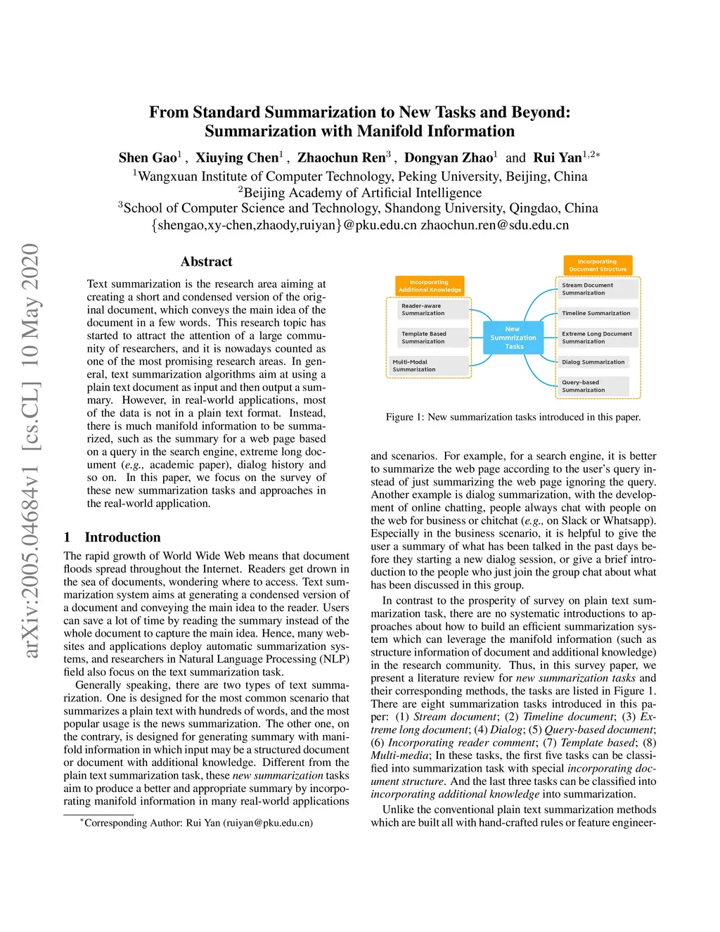Text summarization is the research area aiming at creating a short and condensed version of the original document, which conveys the main idea of the document in a few words. This research topic has started to attract the attention of a large community of researchers, and it is nowadays counted as one of the most promising research areas. In general, text summarization algorithms aim at using a plain text document as input and then output a summary. However, in real-world applications, most of the data is not in a plain text format. Instead, there is much manifold information to be summarized, such as the summary for a web page based on a query in the search engine, extreme long document (e.g., academic paper), dialog history and so on. In this paper, we focus on the survey of these new summarization tasks and approaches in the real-world application.