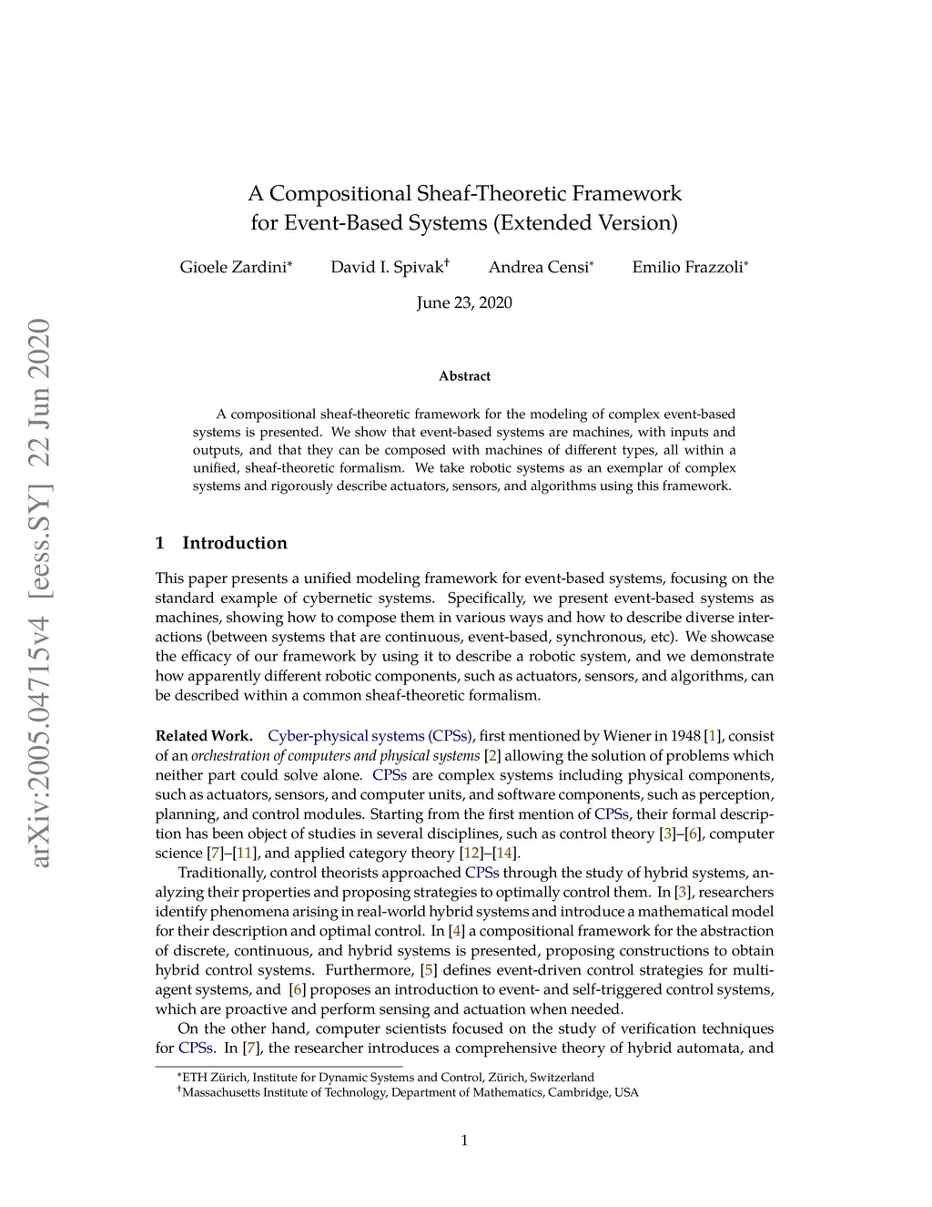 A compositional sheaf-theoretic framework for the modeling of complex event-based systems is presented. We show that event-based systems are machines, with inputs and outputs, and that they can be composed with machines of different types, all within a unified, sheaf-theoretic formalism. We take robotic systems as an exemplar of complex systems and rigorously describe actuators, sensors, and algorithms using this framework.
