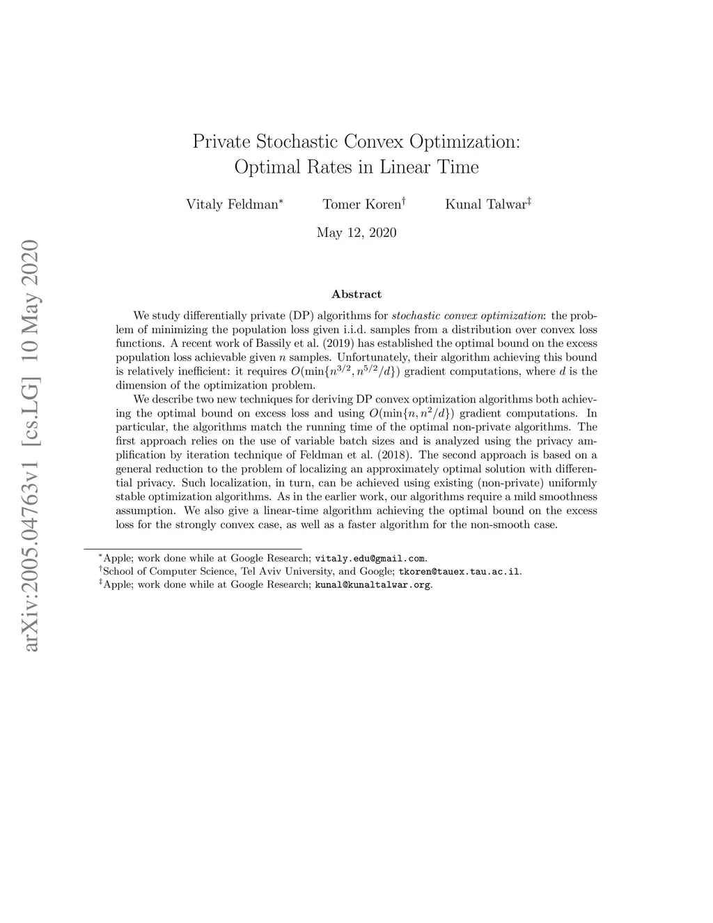 We study differentially private (DP) algorithms for stochastic convex optimization: the problem of minimizing the population loss given i.i.d. samples from a distribution over convex loss functions. A recent work of Bassily et al. (2019) has established the optimal bound on the excess population loss achievable given samples. Unfortunately, their algorithm achieving this bound is relatively inefficient: it requires gradient computations, where is the dimension of the optimization problem. We describe two new techniques for deriving DP convex optimization algorithms both achieving the optimal bound on excess loss and using gradient computations. In particular, the algorithms match the running time of the optimal non-private algorithms. The first approach relies on the use of variable batch sizes and is analyzed using the privacy amplification by iteration technique of Feldman et al. (2018). The second approach is based on a general reduction to the problem of localizing an approximately optimal solution with differential privacy. Such localization, in turn, can be achieved using existing (non-private) uniformly stable optimization algorithms. As in the earlier work, our algorithms require a mild smoothness assumption. We also give a linear-time algorithm achieving the optimal bound on the excess loss for the strongly convex case, as well as a faster algorithm for the non-smooth case.