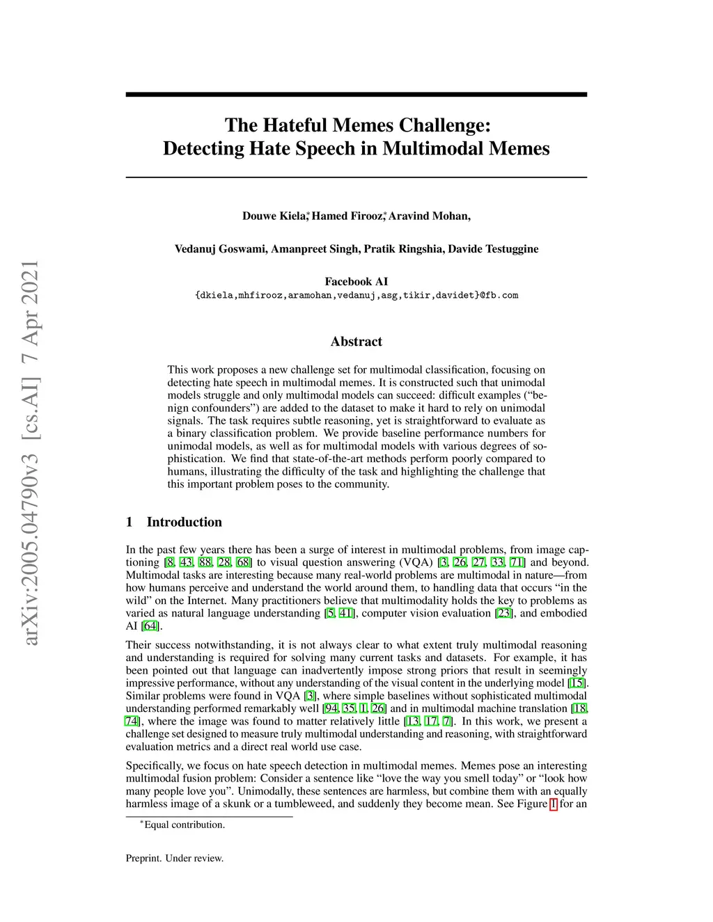 This work proposes a new challenge set for multimodal classification, focusing on detecting hate speech in multimodal memes. It is constructed such that unimodal models struggle and only multimodal models can succeed: difficult examples ("benign confounders") are added to the dataset to make it hard to rely on unimodal signals. The task requires subtle reasoning, yet is straightforward to evaluate as a binary classification problem. We provide baseline performance numbers for unimodal models, as well as for multimodal models with various degrees of sophistication. We find that state-of-the-art methods perform poorly compared to humans (64.73% vs. 84.7% accuracy), illustrating the difficulty of the task and highlighting the challenge that this important problem poses to the community.