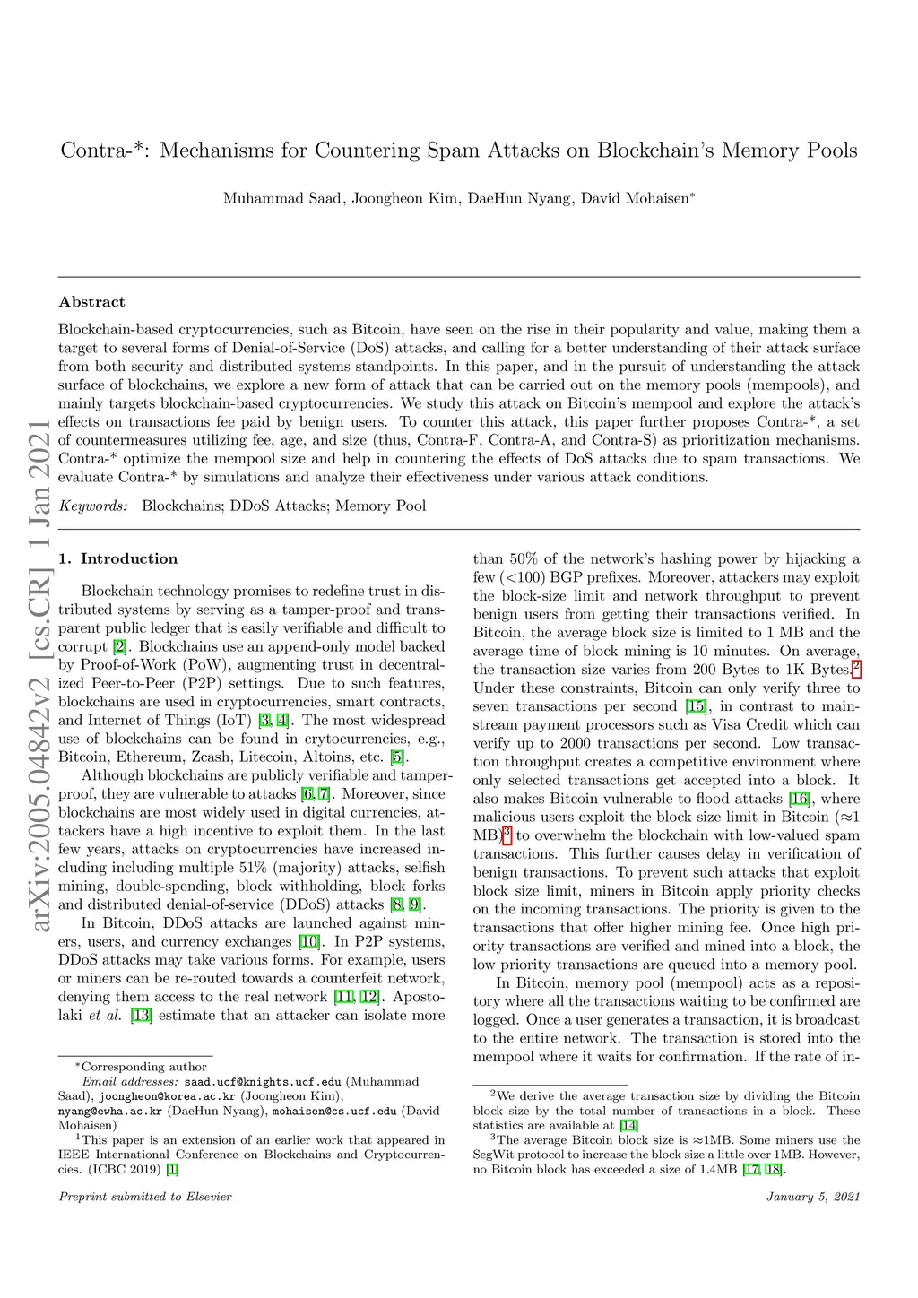 Blockchain-based cryptocurrencies, such as Bitcoin, have seen on the rise in their popularity and value, making them a target to several forms of Denial-of-Service (DoS) attacks, and calling for a better understanding of their attack surface from both security and distributed systems standpoints. In this paper, and in the pursuit of understanding the attack surface of blockchains, we explore a new form of attack that can be carried out on the memory pools (mempools) and mainly targets blockchain-based cryptocurrencies. We study this attack on Bitcoin mempool and explore the attack effects on transactions fee paid by benign users. To counter this attack, this paper further proposes Contra-*:, a set of countermeasures utilizing fee, age, and size (thus, Contra-F, Contra-A, and Contra-S) as prioritization mechanisms. Contra-*: optimize the mempool size and help in countering the effects of DoS attacks due to spam transactions. We evaluate Contra-* by simulations and analyze their effectiveness under various attack conditions.
