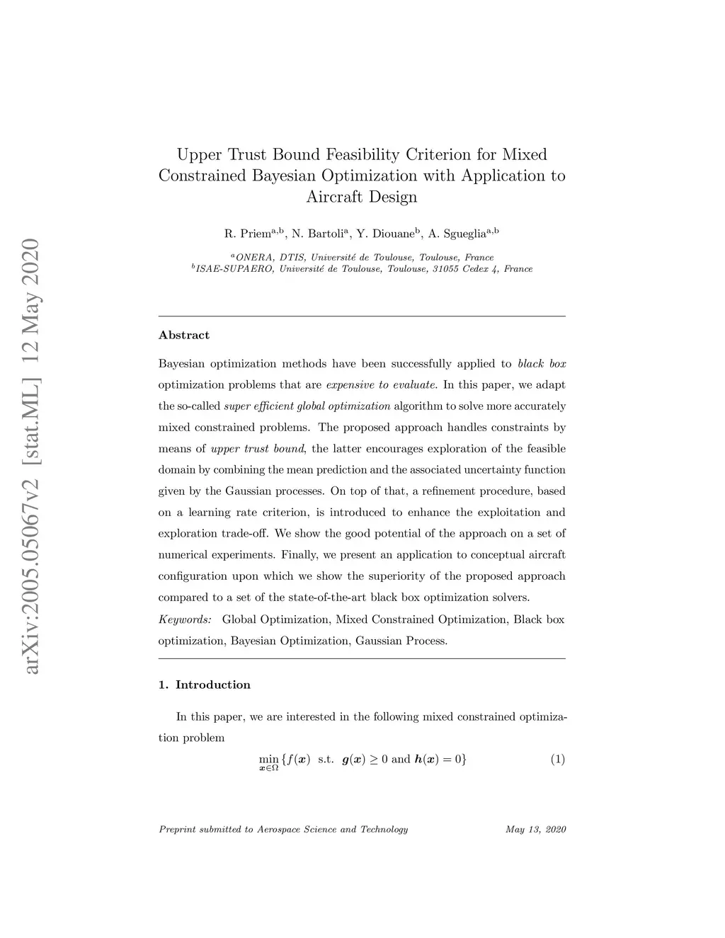 Bayesian optimization methods have been successfully applied to black box optimization problems that are expensive to evaluate. In this paper, we adapt the so-called super effcient global optimization algorithm to solve more accurately mixed constrained problems. The proposed approach handles constraints by means of upper trust bound, the latter encourages exploration of the feasible domain by combining the mean prediction and the associated uncertainty function given by the Gaussian processes. On top of that, a refinement procedure, based on a learning rate criterion, is introduced to enhance the exploitation and exploration trade-off. We show the good potential of the approach on a set of numerical experiments. Finally, we present an application to conceptual aircraft configuration upon which we show the superiority of the proposed approach compared to a set of the state-of-the-art black box optimization solvers. Keywords: Global Optimization, Mixed Constrained Optimization, Black box optimization, Bayesian Optimization, Gaussian Process.