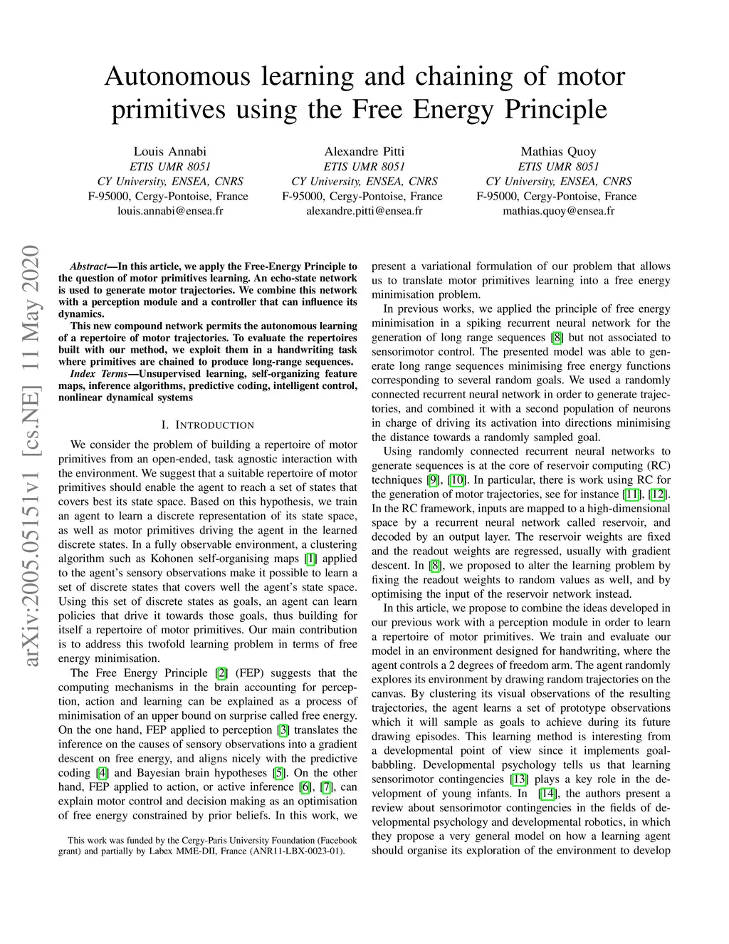 In this article, we apply the Free-Energy Principle to the question of motor primitives learning. An echo-state network is used to generate motor trajectories. We combine this network with a perception module and a controller that can influence its dynamics. This new compound network permits the autonomous learning of a repertoire of motor trajectories. To evaluate the repertoires built with our method, we exploit them in a handwriting task where primitives are chained to produce long-range sequences.