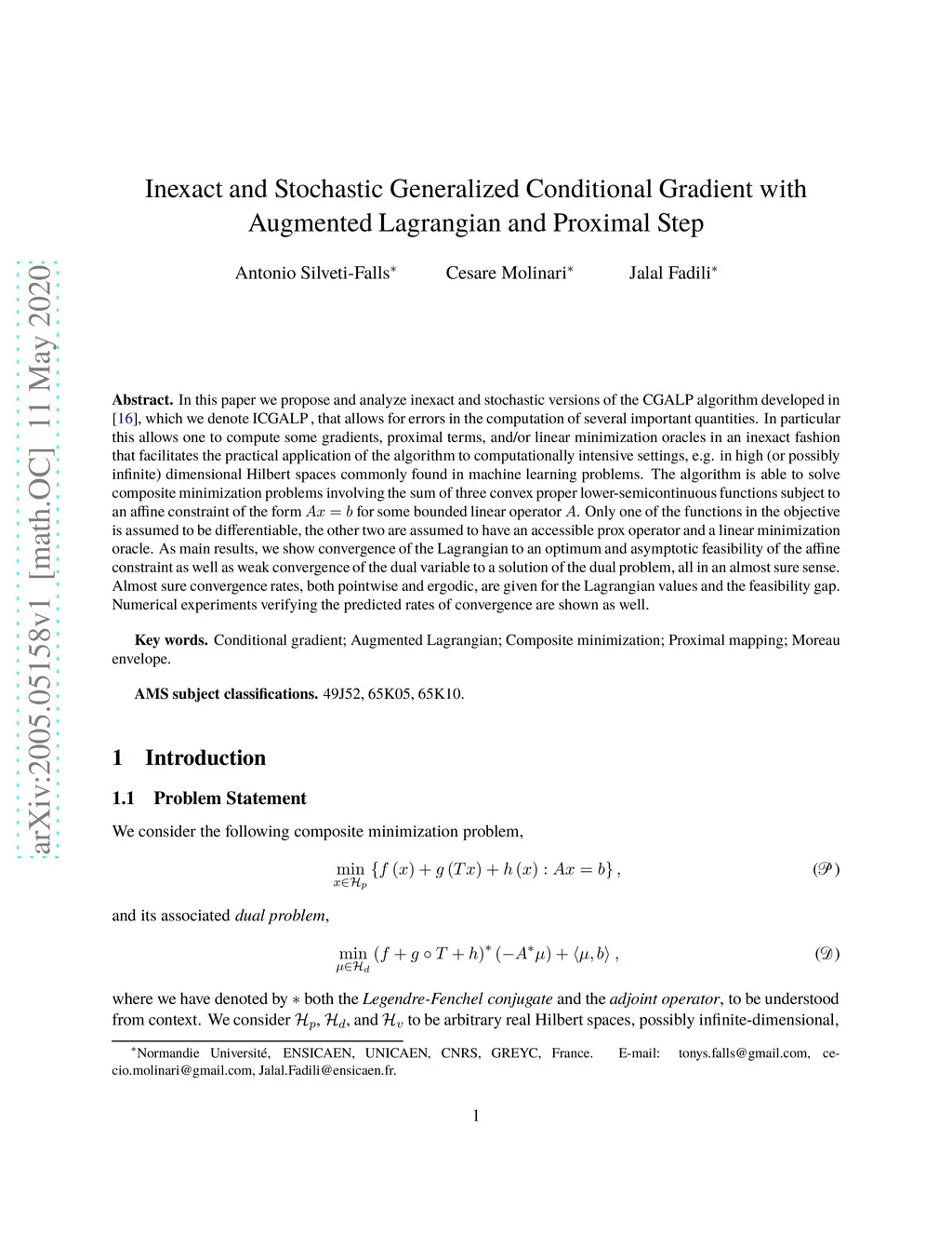 In this paper we propose and analyze inexact and stochastic versions of the CGALP algorithm developed in the authors' previous paper, which we denote ICGALP, that allows for errors in the computation of several important quantities. In particular this allows one to compute some gradients, proximal terms, and/or linear minimization oracles in an inexact fashion that facilitates the practical application of the algorithm to computationally intensive settings, e.g. in high (or possibly infinite) dimensional Hilbert spaces commonly found in machine learning problems. The algorithm is able to solve composite minimization problems involving the sum of three convex proper lower-semicontinuous functions subject to an affine constraint of the form for some bounded linear operator . Only one of the functions in the objective is assumed to be differentiable, the other two are assumed to have an accessible prox operator and a linear minimization oracle. As main results, we show convergence of the Lagrangian to an optimum and asymptotic feasibility of the affine constraint as well as weak convergence of the dual variable to a solution of the dual problem, all in an almost sure sense. Almost sure convergence rates, both pointwise and ergodic, are given for the Lagrangian values and the feasibility gap. Numerical experiments verifying the predicted rates of convergence are shown as well.