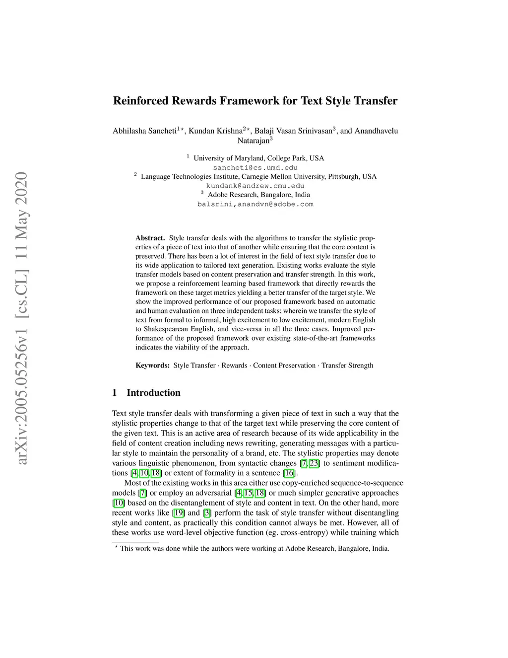 Style transfer deals with the algorithms to transfer the stylistic properties of a piece of text into that of another while ensuring that the core content is preserved. There has been a lot of interest in the field of text style transfer due to its wide application to tailored text generation. Existing works evaluate the style transfer models based on content preservation and transfer strength. In this work, we propose a reinforcement learning based framework that directly rewards the framework on these target metrics yielding a better transfer of the target style. We show the improved performance of our proposed framework based on automatic and human evaluation on three independent tasks: wherein we transfer the style of text from formal to informal, high excitement to low excitement, modern English to Shakespearean English, and vice-versa in all the three cases. Improved performance of the proposed framework over existing state-of-the-art frameworks indicates the viability of the approach.