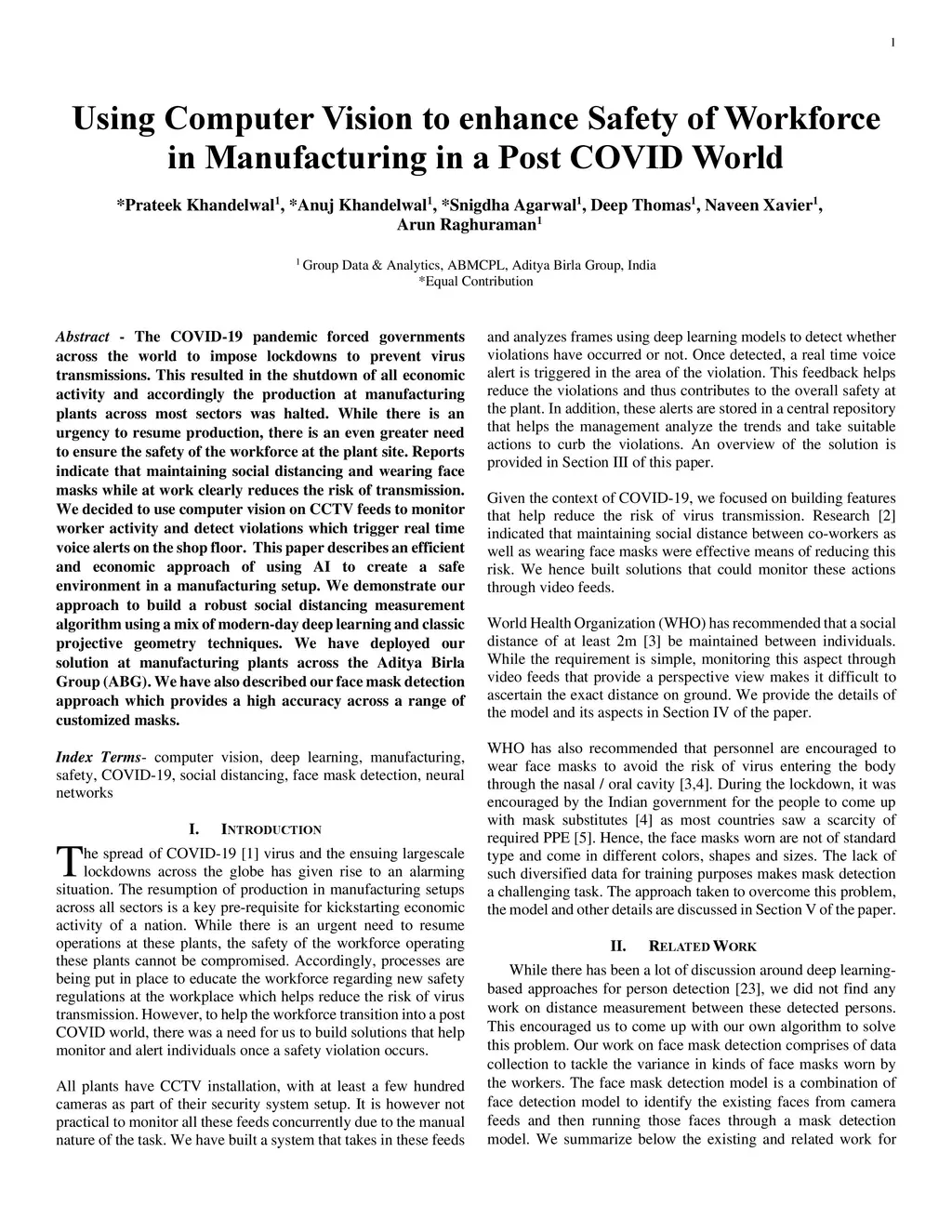 The COVID-19 pandemic forced governments across the world to impose lockdowns to prevent virus transmissions. This resulted in the shutdown of all economic activity and accordingly the production at manufacturing plants across most sectors was halted. While there is an urgency to resume production, there is an even greater need to ensure the safety of the workforce at the plant site. Reports indicate that maintaining social distancing and wearing face masks while at work clearly reduces the risk of transmission. We decided to use computer vision on CCTV feeds to monitor worker activity and detect violations which trigger real time voice alerts on the shop floor. This paper describes an efficient and economic approach of using AI to create a safe environment in a manufacturing setup. We demonstrate our approach to build a robust social distancing measurement algorithm using a mix of modern-day deep learning and classic projective geometry techniques. We have deployed our solution at manufacturing plants across the Aditya Birla Group (ABG). We have also described our face mask detection approach which provides a high accuracy across a range of customized masks.