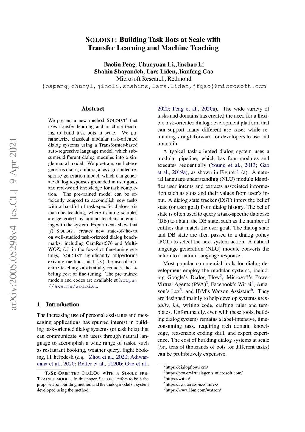 SOLOIST: Building Task Bots at Scale with Transfer Learning and Machine