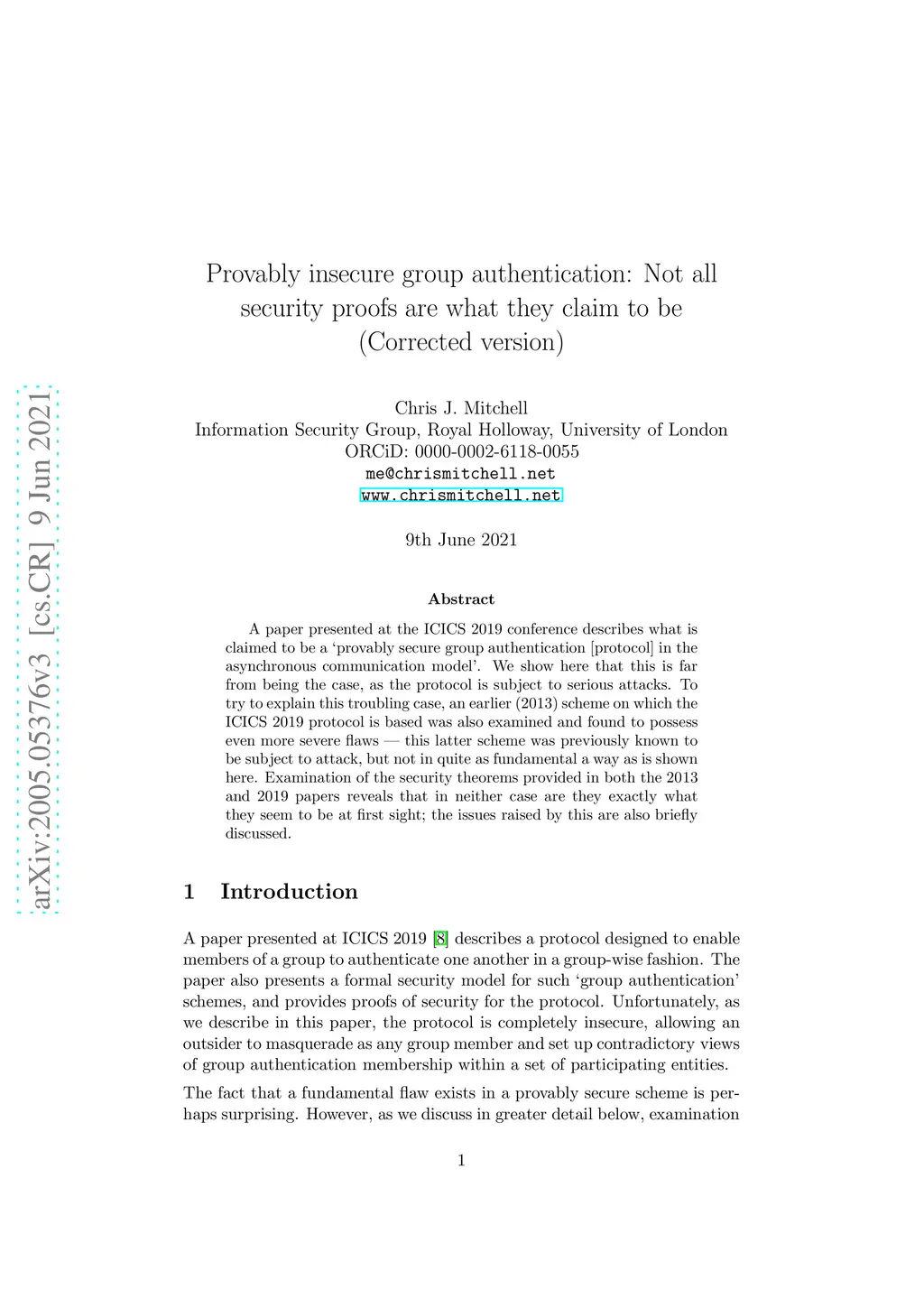 A paper presented at the ICICS 2019 conference describes what is claimed to be a `provably secure group authentication [protocol] in the asynchronous communication model'. We show here that this is far from being the case, as the protocol is subject to serious attacks. To try to explain this troubling case, an earlier (2013) scheme on which the ICICS 2019 protocol is based was also examined and found to possess even more severe flaws - this latter scheme was previously known to be subject to attack, but not in quite as fundamental a way as is shown here. Examination of the security theorems provided in both the 2013 and 2019 papers reveals that in neither case are they exactly what they seem to be at first sight; the issues raised by this are also briefly discussed.