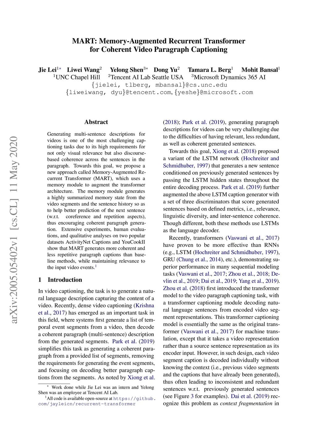 MART: Memory-Augmented Recurrent Transformer for Coherent Video