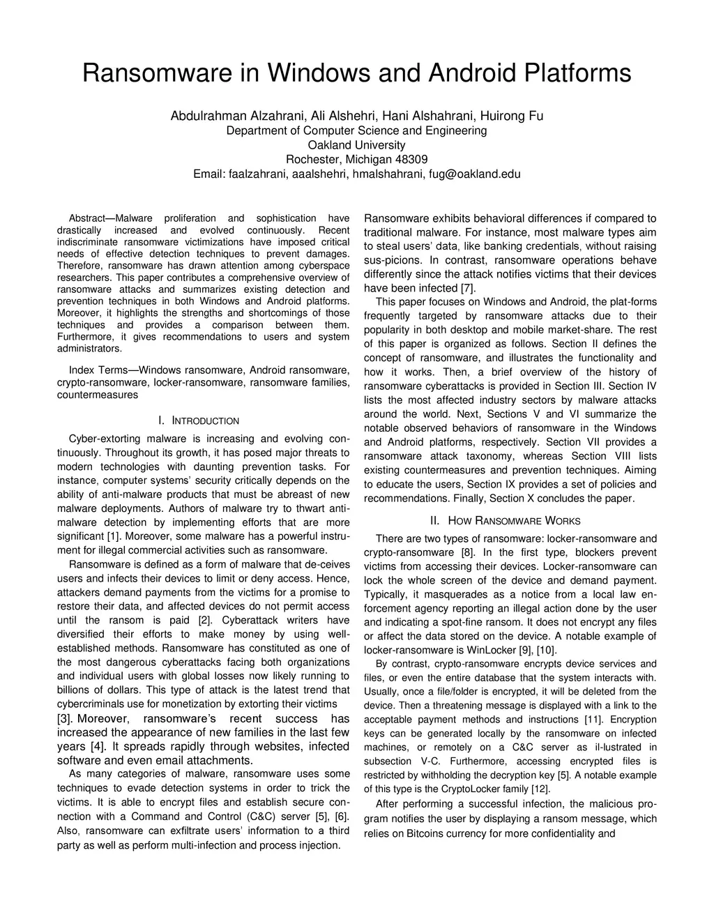 Malware proliferation and sophistication have drastically increased and evolved continuously. Recent indiscriminate ransomware victimizations have imposed critical needs of effective detection techniques to prevent damages. Therefore, ransomware has drawn attention among cyberspace researchers. This paper contributes a comprehensive overview of ransomware attacks and summarizes existing detection and prevention techniques in both Windows and Android platforms. Moreover, it highlights the strengths and shortcomings of those techniques and provides a comparison between them. Furthermore, it gives recommendations to users and system administrators.