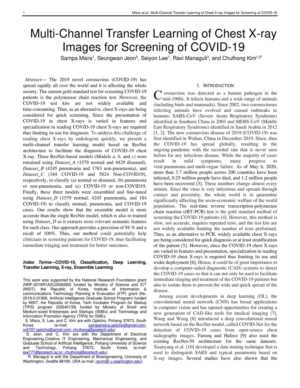 The 2019 novel coronavirus (COVID-19) has spread rapidly all over the world and it is affecting the whole society. The current gold standard test for screening COVID-19 patients is the polymerase chain reaction test. However, the COVID-19 test kits are not widely available and time-consuming. Thus, as an alternative, chest X-rays are being considered for quick screening. Since the presentation of COVID-19 in chest X-rays is varied in features and specialization in reading COVID-19 chest X-rays are required thus limiting its use for diagnosis. To address this challenge of reading chest X-rays by radiologists quickly, we present a multi-channel transfer learning model based on ResNet architecture to facilitate the diagnosis of COVID-19 chest X-ray. Three ResNet-based models (Models a, b, and c) were retrained using Dataset_A (1579 normal and 4429 diseased), Dataset_B (4245 pneumonia and 1763 non-pneumonia), and Dataset_C (184 COVID-19 and 5824 Non-COVID19), respectively, to classify (a) normal or diseased, (b) pneumonia or non-pneumonia, and (c) COVID-19 or non-COVID19. Finally, these three models were ensembled and fine-tuned using Dataset_D (1579 normal, 4245 pneumonia, and 184 COVID-19) to classify normal, pneumonia, and COVID-19 cases. Our results show that the ensemble model is more accurate than the single ResNet model, which is also re-trained using Dataset_D as it extracts more relevant semantic features for each class. Our approach provides a precision of 94 % and a recall of 100%. Thus, our method could potentially help clinicians in screening patients for COVID-19, thus facilitating immediate triaging and treatment for better outcomes.