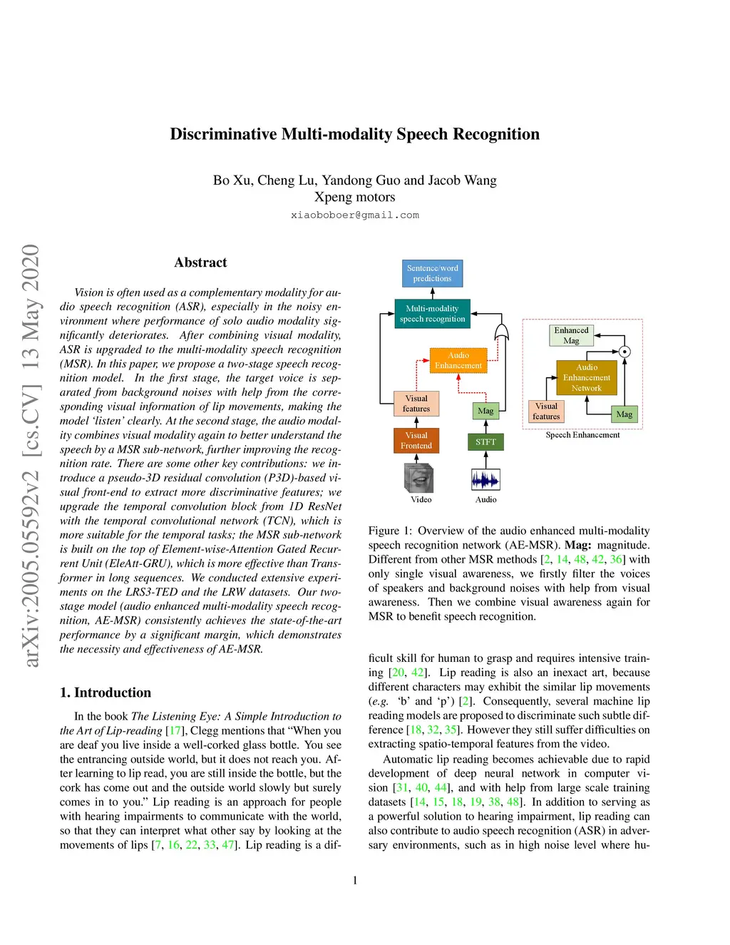 Vision is often used as a complementary modality for audio speech recognition (ASR), especially in the noisy environment where performance of solo audio modality significantly deteriorates. After combining visual modality, ASR is upgraded to the multi-modality speech recognition (MSR). In this paper, we propose a two-stage speech recognition model. In the first stage, the target voice is separated from background noises with help from the corresponding visual information of lip movements, making the model 'listen' clearly. At the second stage, the audio modality combines visual modality again to better understand the speech by a MSR sub-network, further improving the recognition rate. There are some other key contributions: we introduce a pseudo-3D residual convolution (P3D)-based visual front-end to extract more discriminative features; we upgrade the temporal convolution block from 1D ResNet with the temporal convolutional network (TCN), which is more suitable for the temporal tasks; the MSR sub-network is built on the top of Element-wise-Attention Gated Recurrent Unit (EleAtt-GRU), which is more effective than Transformer in long sequences. We conducted extensive experiments on the LRS3-TED and the LRW datasets. Our two-stage model (audio enhanced multi-modality speech recognition, AE-MSR) consistently achieves the state-of-the-art performance by a significant margin, which demonstrates the necessity and effectiveness of AE-MSR.