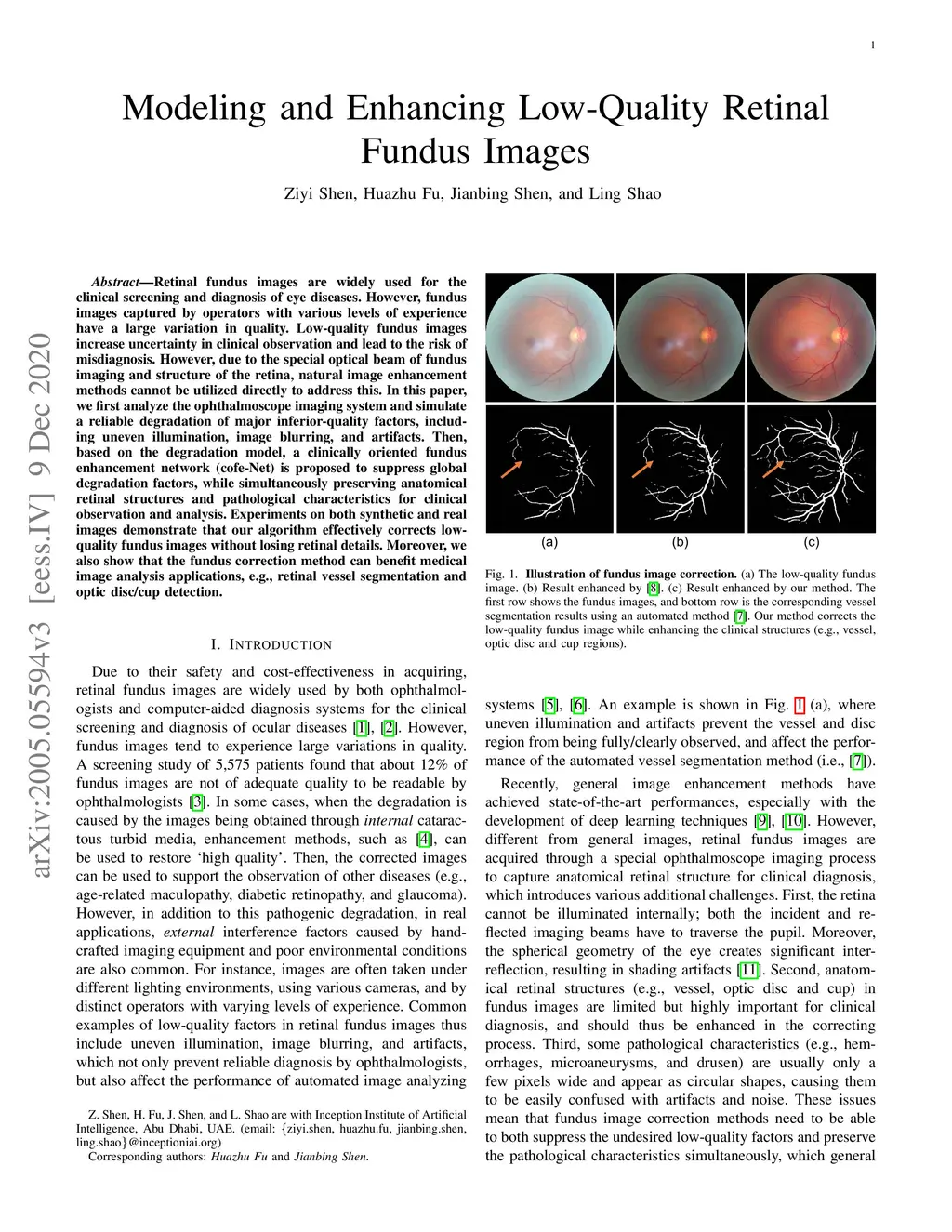 Retinal fundus images are widely used for the clinical screening and diagnosis of eye diseases. However, fundus images captured by operators with various levels of experience have a large variation in quality. Low-quality fundus images increase uncertainty in clinical observation and lead to the risk of misdiagnosis. However, due to the special optical beam of fundus imaging and structure of the retina, natural image enhancement methods cannot be utilized directly to address this. In this paper, we first analyze the ophthalmoscope imaging system and simulate a reliable degradation of major inferior-quality factors, including uneven illumination, image blurring, and artifacts. Then, based on the degradation model, a clinically oriented fundus enhancement network (cofe-Net) is proposed to suppress global degradation factors, while simultaneously preserving anatomical retinal structures and pathological characteristics for clinical observation and analysis. Experiments on both synthetic and real images demonstrate that our algorithm effectively corrects low-quality fundus images without losing retinal details. Moreover, we also show that the fundus correction method can benefit medical image analysis applications, e.g., retinal vessel segmentation and optic disc/cup detection.
