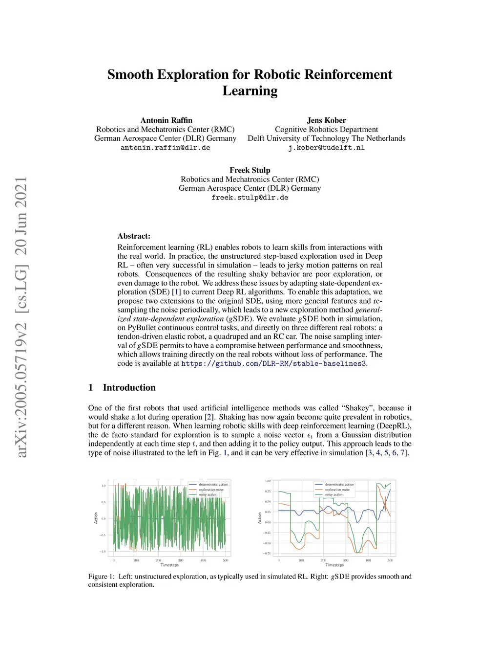 Reinforcement learning (RL) enables robots to learn skills from interactions with the real world. In practice, the unstructured step-based exploration used in Deep RL -- often very successful in simulation -- leads to jerky motion patterns on real robots. Consequences of the resulting shaky behavior are poor exploration, or even damage to the robot. We address these issues by adapting state-dependent exploration (SDE) to current Deep RL algorithms. To enable this adaptation, we propose two extensions to the original SDE, using more general features and re-sampling the noise periodically, which leads to a new exploration method generalized state-dependent exploration (gSDE). We evaluate gSDE both in simulation, on PyBullet continuous control tasks, and directly on three different real robots: a tendon-driven elastic robot, a quadruped and an RC car. The noise sampling interval of gSDE permits to have a compromise between performance and smoothness, which allows training directly on the real robots without loss of performance. The code is available at https://github.com/DLR-RM/stable-baselines3.