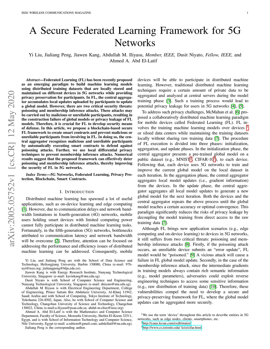 Federated Learning (FL) has been recently proposed as an emerging paradigm to build machine learning models using distributed training datasets that are locally stored and maintained on different devices in 5G networks while providing privacy preservation for participants. In FL, the central aggregator accumulates local updates uploaded by participants to update a global model. However, there are two critical security threats: poisoning and membership inference attacks. These attacks may be carried out by malicious or unreliable participants, resulting in the construction failure of global models or privacy leakage of FL models. Therefore, it is crucial for FL to develop security means of defense. In this article, we propose a blockchain-based secure FL framework to create smart contracts and prevent malicious or unreliable participants from involving in FL. In doing so, the central aggregator recognizes malicious and unreliable participants by automatically executing smart contracts to defend against poisoning attacks. Further, we use local differential privacy techniques to prevent membership inference attacks. Numerical results suggest that the proposed framework can effectively deter poisoning and membership inference attacks, thereby improving the security of FL in 5G networks.