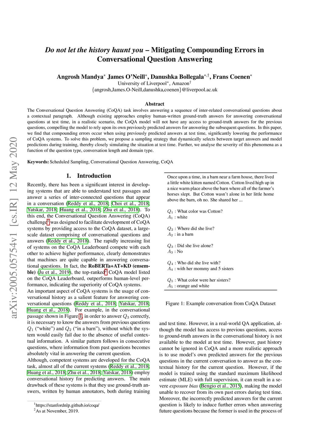 The Conversational Question Answering (CoQA) task involves answering a sequence of inter-related conversational questions about a contextual paragraph. Although existing approaches employ human-written ground-truth answers for answering conversational questions at test time, in a realistic scenario, the CoQA model will not have any access to ground-truth answers for the previous questions, compelling the model to rely upon its own previously predicted answers for answering the subsequent questions. In this paper, we find that compounding errors occur when using previously predicted answers at test time, significantly lowering the performance of CoQA systems. To solve this problem, we propose a sampling strategy that dynamically selects between target answers and model predictions during training, thereby closely simulating the situation at test time. Further, we analyse the severity of this phenomena as a function of the question type, conversation length and domain type.