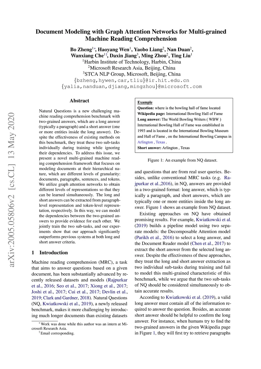 Natural Questions is a new challenging machine reading comprehension benchmark with two-grained answers, which are a long answer (typically a paragraph) and a short answer (one or more entities inside the long answer). Despite the effectiveness of existing methods on this benchmark, they treat these two sub-tasks individually during training while ignoring their dependencies. To address this issue, we present a novel multi-grained machine reading comprehension framework that focuses on modeling documents at their hierarchical nature, which are different levels of granularity: documents, paragraphs, sentences, and tokens. We utilize graph attention networks to obtain different levels of representations so that they can be learned simultaneously. The long and short answers can be extracted from paragraph-level representation and token-level representation, respectively. In this way, we can model the dependencies between the two-grained answers to provide evidence for each other. We jointly train the two sub-tasks, and our experiments show that our approach significantly outperforms previous systems at both long and short answer criteria.