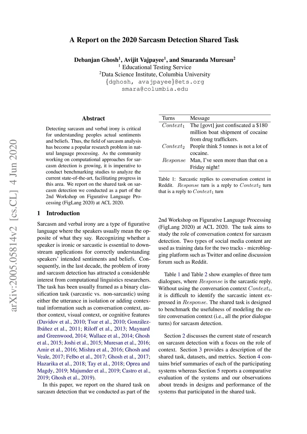 Detecting sarcasm and verbal irony is critical for understanding people's actual sentiments and beliefs. Thus, the field of sarcasm analysis has become a popular research problem in natural language processing. As the community working on computational approaches for sarcasm detection is growing, it is imperative to conduct benchmarking studies to analyze the current state-of-the-art, facilitating progress in this area. We report on the shared task on sarcasm detection we conducted as a part of the 2nd Workshop on Figurative Language Processing (FigLang 2020) at ACL 2020.