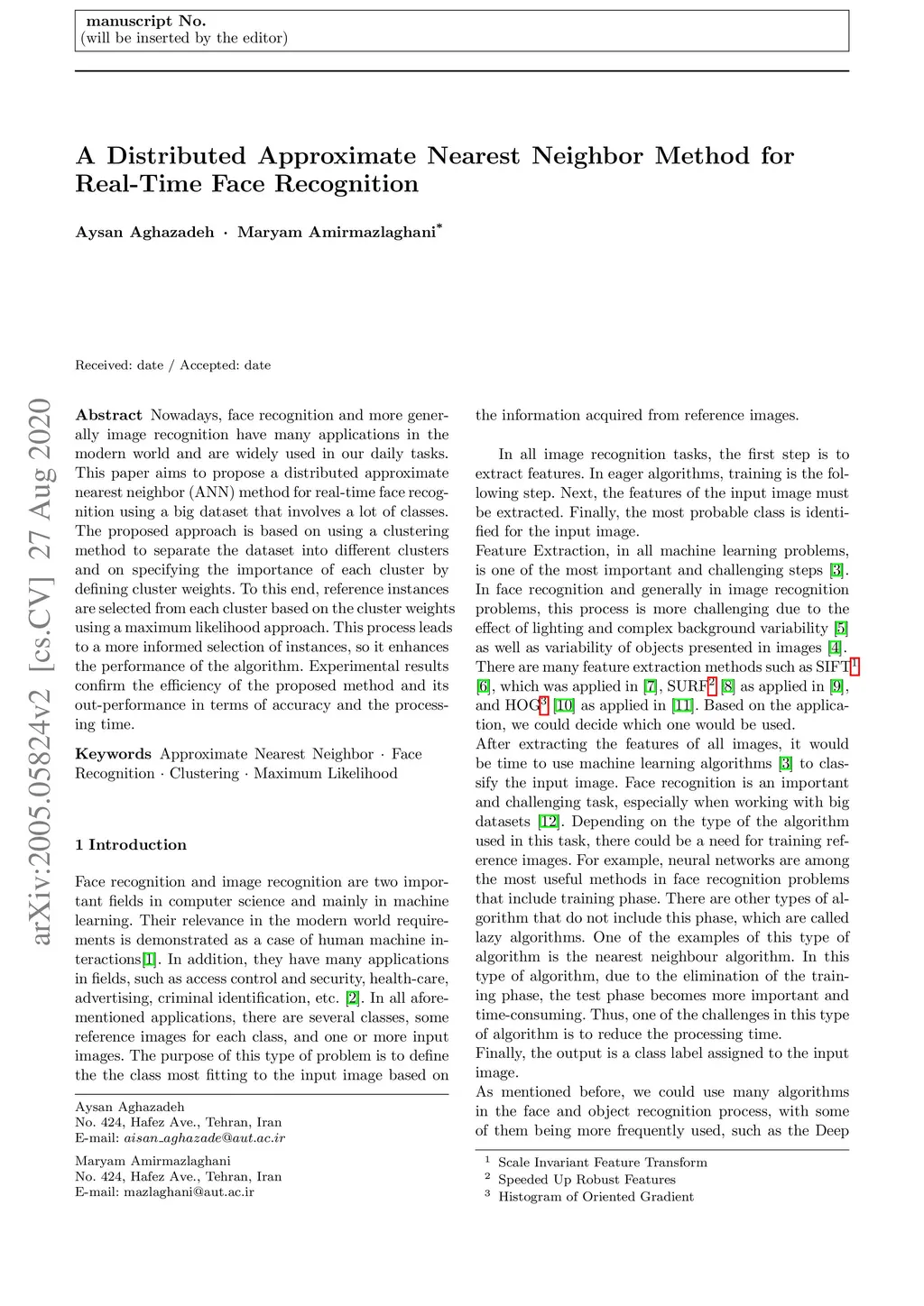 Nowadays, face recognition and more generally image recognition have many applications in the modern world and are widely used in our daily tasks. This paper aims to propose a distributed approximate nearest neighbor (ANN) method for real-time face recognition using a big dataset that involves a lot of classes. The proposed approach is based on using a clustering method to separate the dataset into different clusters and on specifying the importance of each cluster by defining cluster weights. To this end, reference instances are selected from each cluster based on the cluster weights using a maximum likelihood approach. This process leads to a more informed selection of instances, so it enhances the performance of the algorithm. Experimental results confirm the efficiency of the proposed method and its out-performance in terms of accuracy and the processing time.