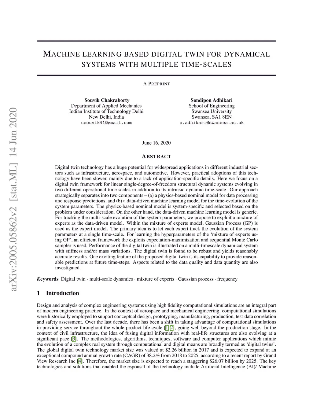 Digital twin technology has a huge potential for widespread applications in different industrial sectors such as infrastructure, aerospace, and automotive. However, practical adoptions of this technology have been slower, mainly due to a lack of application-specific details. Here we focus on a digital twin framework for linear single-degree-of-freedom structural dynamic systems evolving in two different operational time scales in addition to its intrinsic dynamic time-scale. Our approach strategically separates into two components -- (a) a physics-based nominal model for data processing and response predictions, and (b) a data-driven machine learning model for the time-evolution of the system parameters. The physics-based nominal model is system-specific and selected based on the problem under consideration. On the other hand, the data-driven machine learning model is generic. For tracking the multi-scale evolution of the system parameters, we propose to exploit a mixture of experts as the data-driven model. Within the mixture of experts model, Gaussian Process (GP) is used as the expert model. The primary idea is to let each expert track the evolution of the system parameters at a single time-scale. For learning the hyperparameters of the `mixture of experts using GP', an efficient framework the exploits expectation-maximization and sequential Monte Carlo sampler is used. Performance of the digital twin is illustrated on a multi-timescale dynamical system with stiffness and/or mass variations. The digital twin is found to be robust and yields reasonably accurate results. One exciting feature of the proposed digital twin is its capability to provide reasonable predictions at future time-steps. Aspects related to the data quality and data quantity are also investigated.