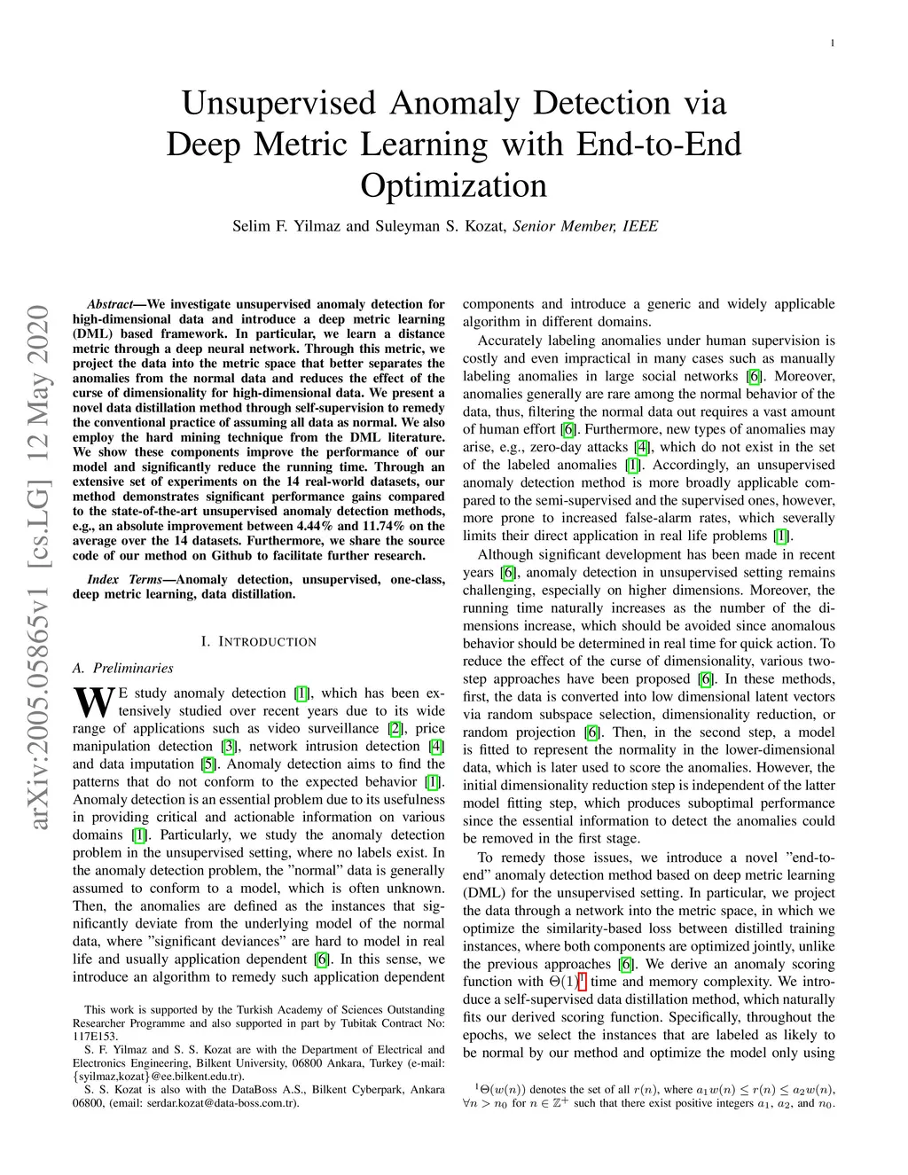 Unsupervised Anomaly Detection via Deep Metric Learning with End-to-End