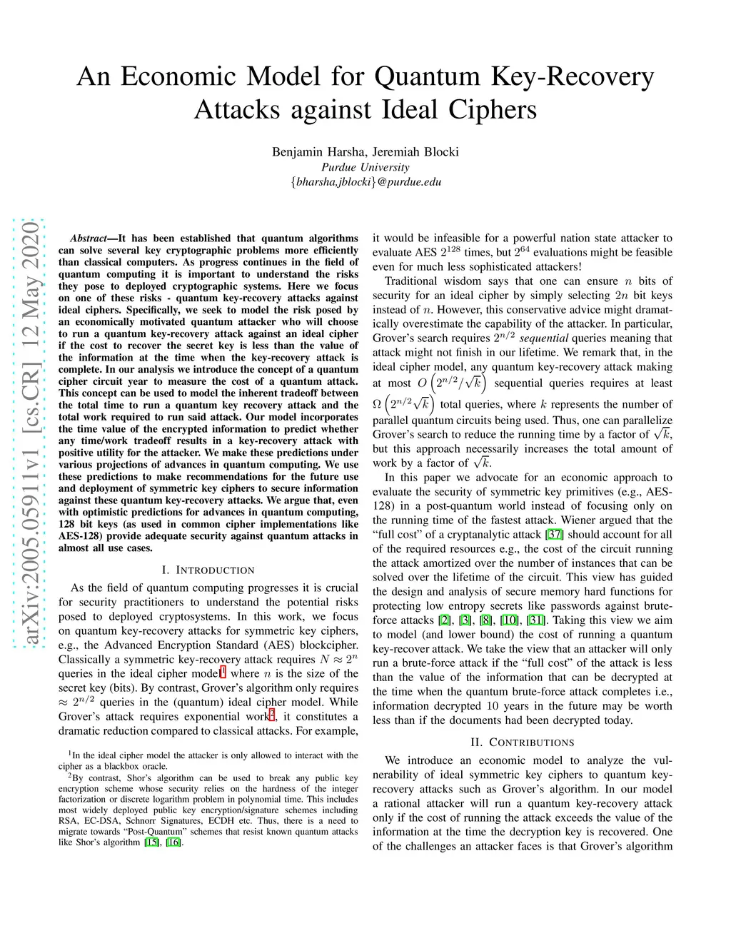 It has been established that quantum algorithms can solve several key cryptographic problems more efficiently than classical computers. As progress continues in the field of quantum computing it is important to understand the risks they pose to deployed cryptographic systems. Here we focus on one of these risks - quantum key-recovery attacks against ideal ciphers. Specifically, we seek to model the risk posed by an economically motivated quantum attacker who will choose to run a quantum key-recovery attack against an ideal cipher if the cost to recover the secret key is less than the value of the information at the time when the key-recovery attack is complete. In our analysis we introduce the concept of a quantum cipher circuit year to measure the cost of a quantum attack. This concept can be used to model the inherent tradeoff between the total time to run a quantum key recovery attack and the total work required to run said attack. Our model incorporates the time value of the encrypted information to predict whether any time/work tradeoff results in a key-recovery attack with positive utility for the attacker. We make these predictions under various projections of advances in quantum computing. We use these predictions to make recommendations for the future use and deployment of symmetric key ciphers to secure information against these quantum key-recovery attacks. We argue that, even with optimistic predictions for advances in quantum computing, 128 bit keys (as used in common cipher implementations like AES-128) provide adequate security against quantum attacks in almost all use cases.
