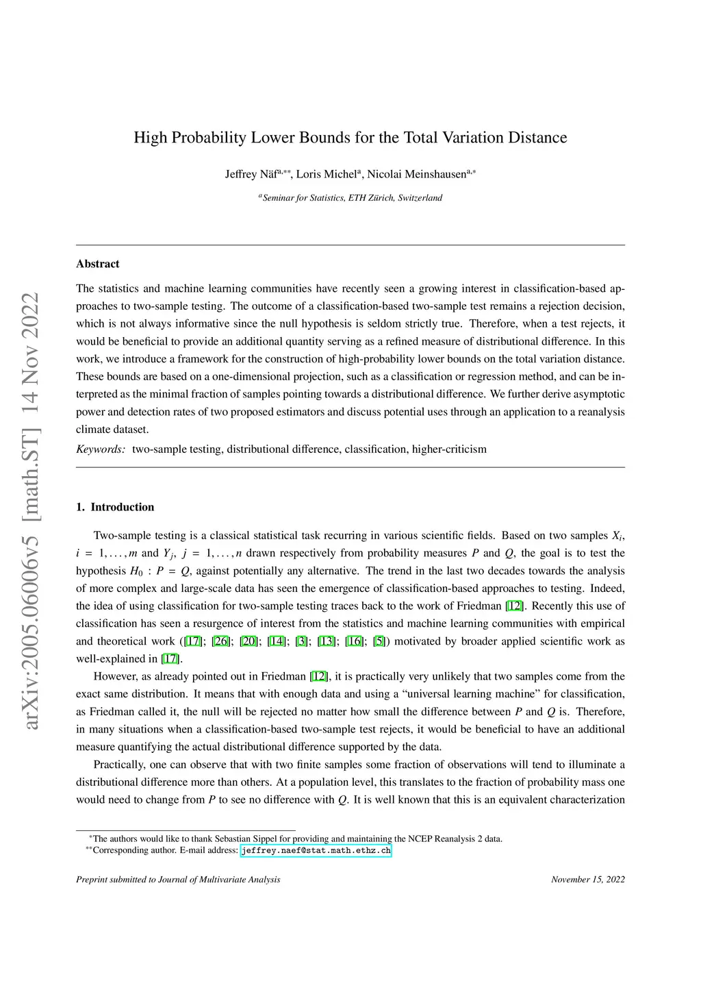 The statistics and machine learning communities have recently seen a growing interest in classification-based approaches to two-sample testing (e.g. Kim et al. [2016]; Rosenblatt et al. [2016]; Lopez-Paz and Oquab [2017]; Hediger et al. [2019]). The outcome of a classification-based two-sample test remains a rejection decision, which is not always informative since the null hypothesis is seldom strictly true. Therefore, when a test rejects, it would be beneficial to provide an additional quantity serving as a refined measure of distributional difference. In this work, we introduce a framework for the construction of high-probability lower bounds on the total variation distance. These bounds are based on a one-dimensional projection, such as a classification or regression method, and can be interpreted as the minimal fraction of samples pointing towards a distributional difference. We further derive asymptotic power and detection rates of two proposed estimators and discuss potential uses through an application to a reanalysis climate dataset.